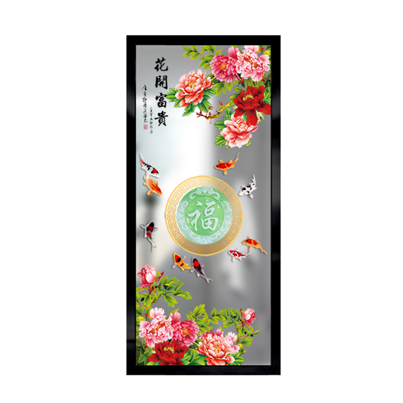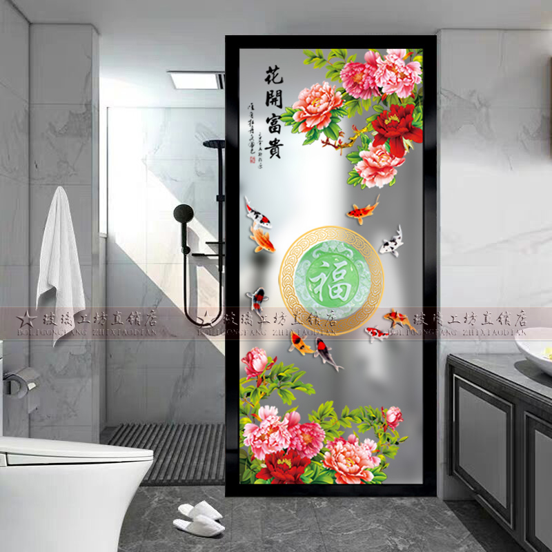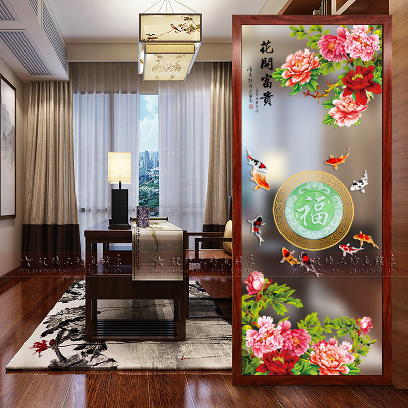 Modern new Chinese decorative tempered art glass frosted transparent carved partition screen living room porch peony fish