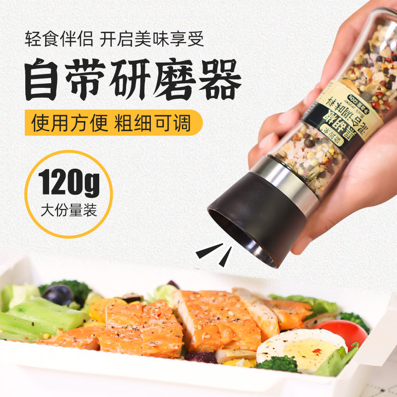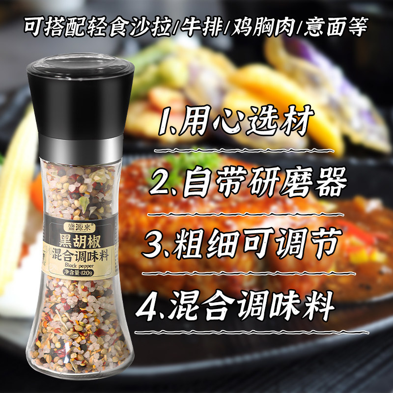 Freshly ground sea salt black pepper mixed seasoning with grinder black pepper crushed whole grain steak compound powder seasoning bottle