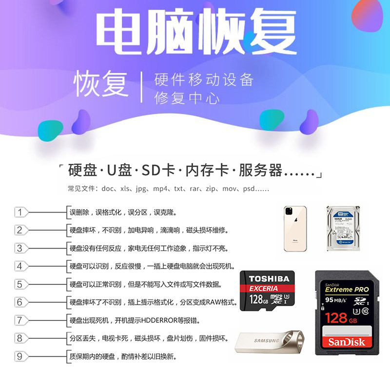 Mobile phone WeChat record chat Computer Portable hard disk Pen drive SD card opening send repair repair Data recovery service