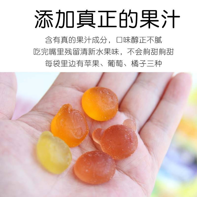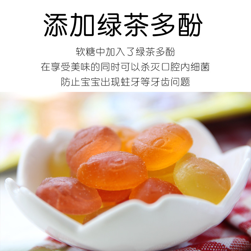 Water confectionery, sugar, juice concentrate (grapes, apples, oranges), starch, green tea extract, emulsifiers, flavors, etc