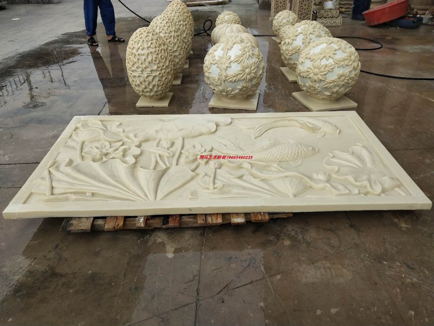 FRP imitation copper artificial sandstone large relief carp lotus flower figure Chinese background wall hotel outdoor decorative painting