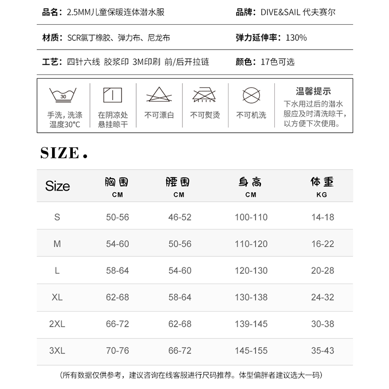S (height 100-110cm) M (height 110-120cm) L (height 120-130cm) XL (height 130-138cm)