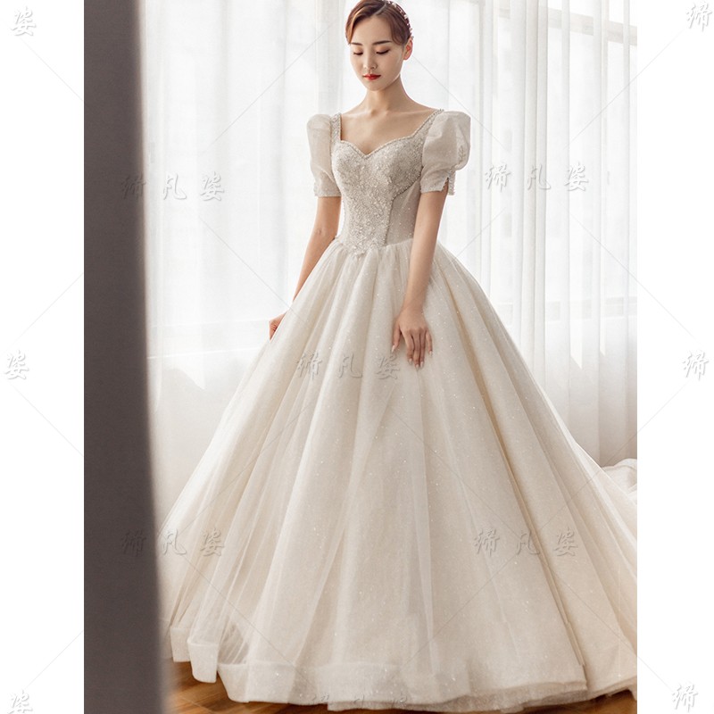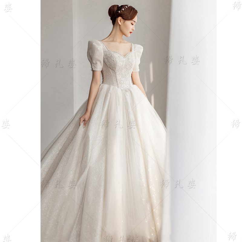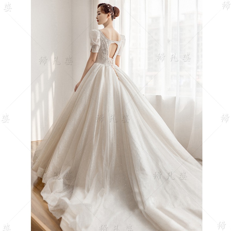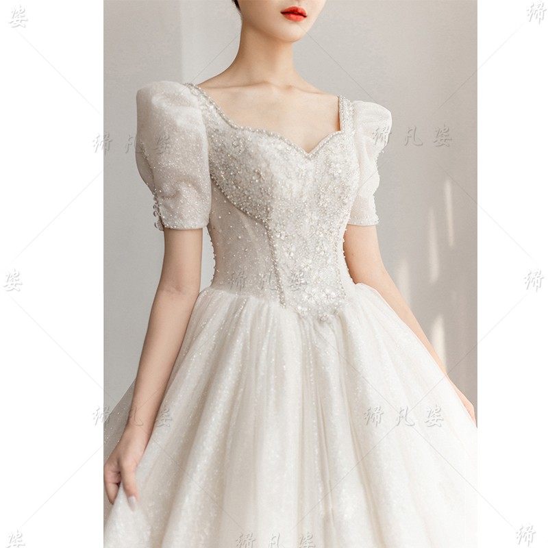 Main wedding dress 2021 New temperament bride tailing out the door gauze red 2022 shoulder light French starry sky