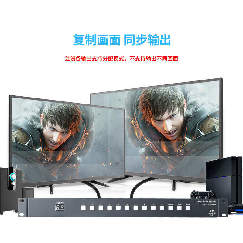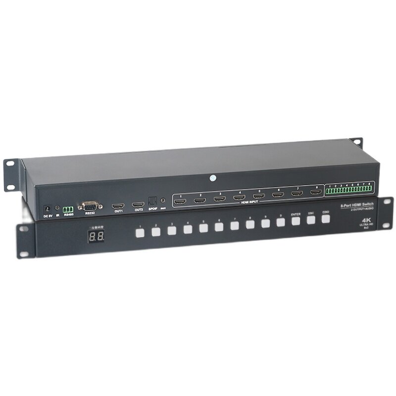 Uber HDMI switcher 8 in 2 out with audio aux fiber 1U industrial grade mid-control RS232 dispenser