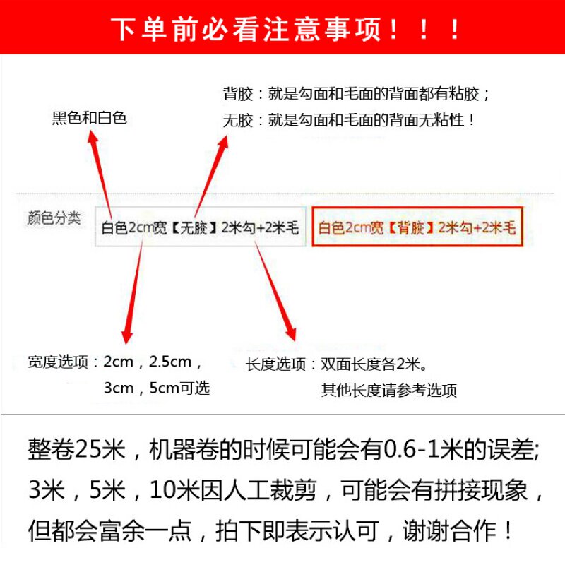 White 2cm wide (adhesive) 2m hook 2m wool black 2cm wide (adhesive) 2m hook 2m white 2cm wide (adhesive) 25m hook 25m wool black 2cm wide (adhesive