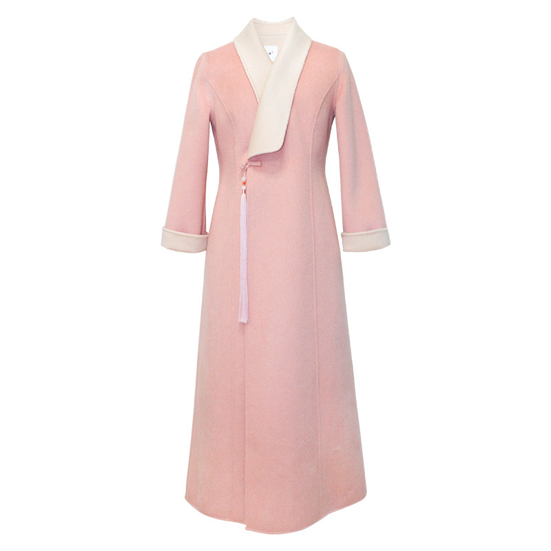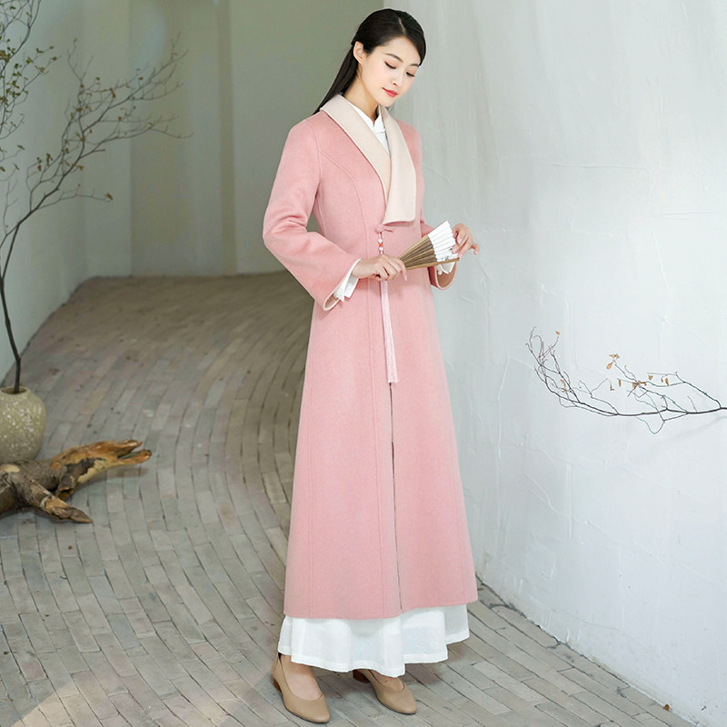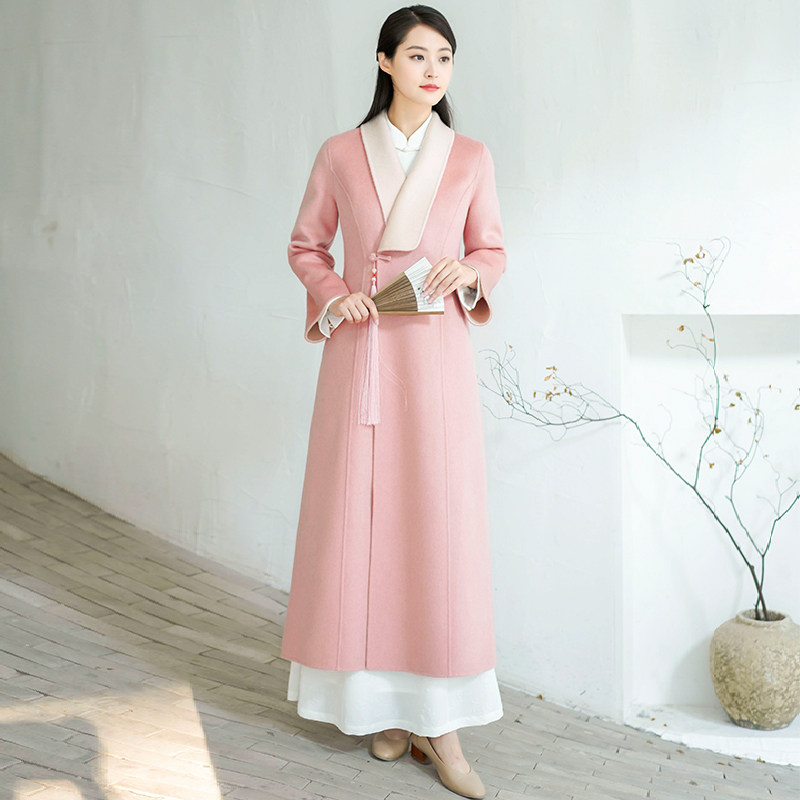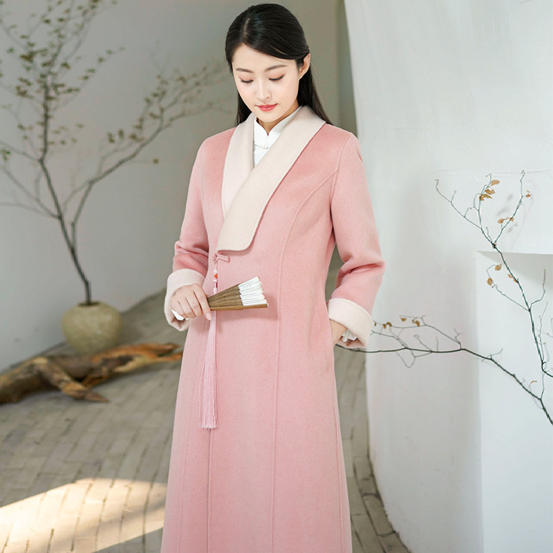 Chinese windy winter double face Coat Pink Chinese Hanfu Qipao Zen Tea Suit Thickened High-end Cashmere Coat Woman
