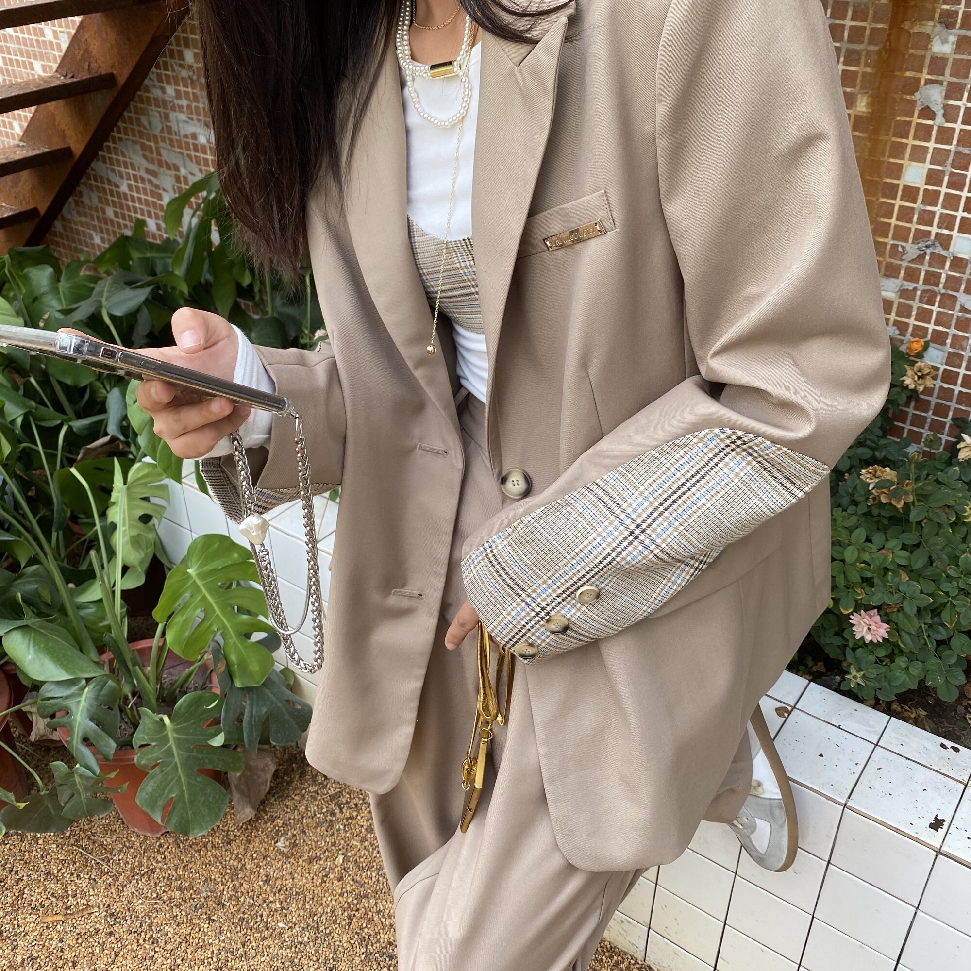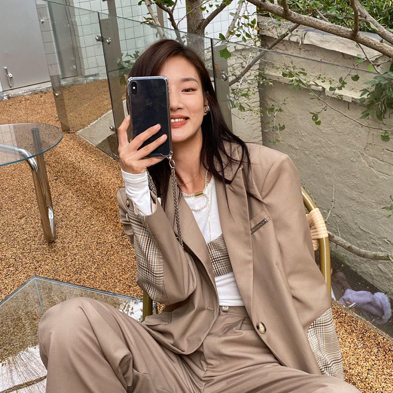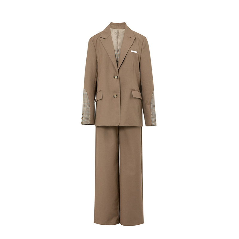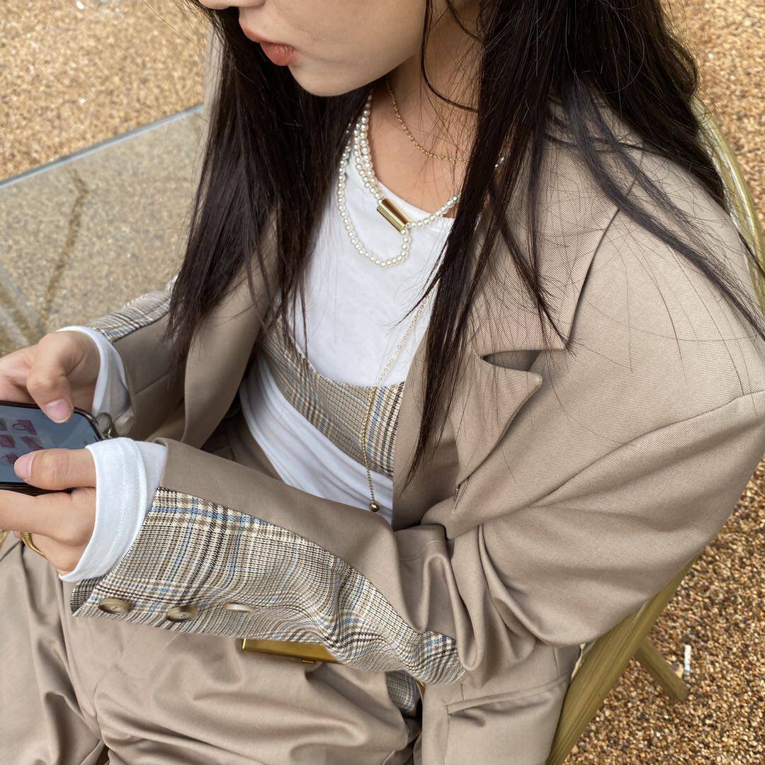 (La lune Du Ciel) LLDC niche design sense Khaki plaid stitching small blazer for women