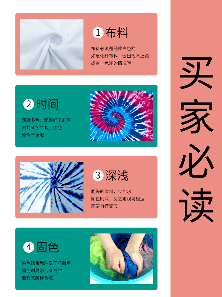 Dark gray black rose red pink burgundy yellow army green dark green emerald green dark blue lake blue navy purple coffee color Cuilan China red dark pink fruit green orange red golden yellow orange yellow brown red purple brown navy blue 25 color dye each bottle of fixing agent 30ML fixing agent 100ML 3 people tie-dye set 6 people tie-dye set 10 people tie-dye set 20 people tie-dye set 50 people tie-dye set