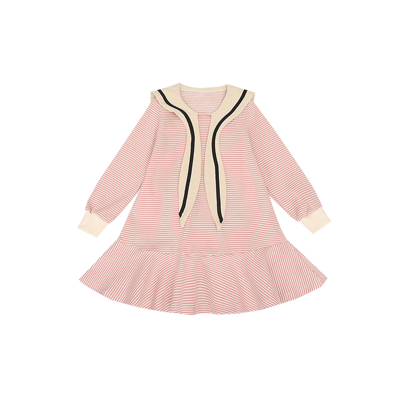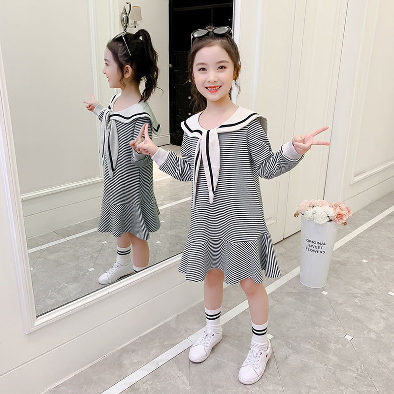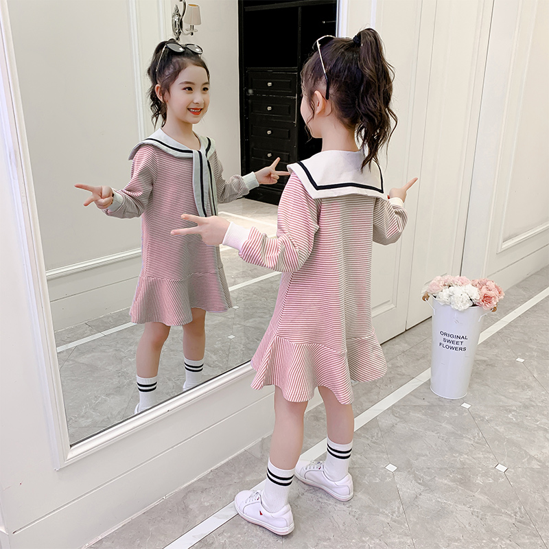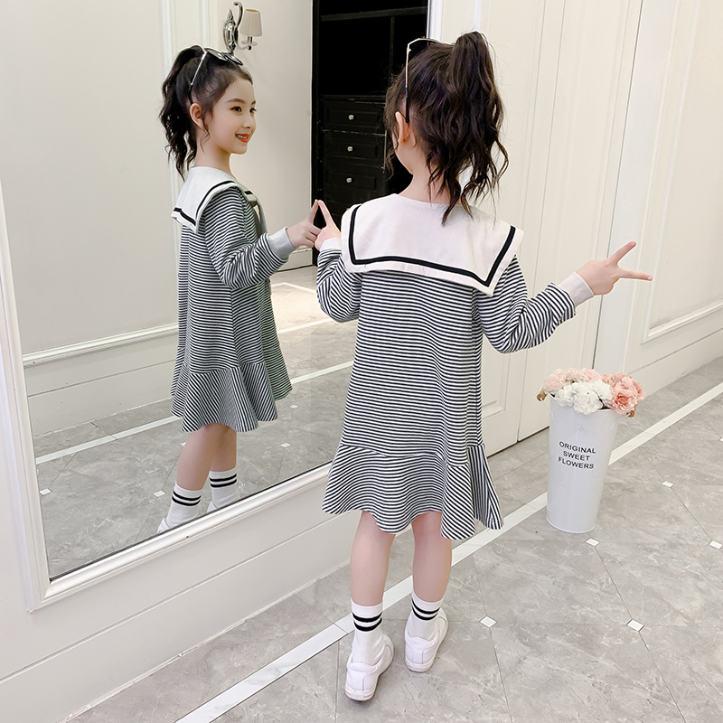 Girls college style dress 2021 spring new little girl long-sleeved navy children's Western style striped princess dress