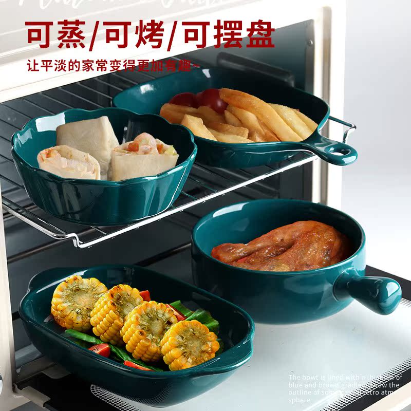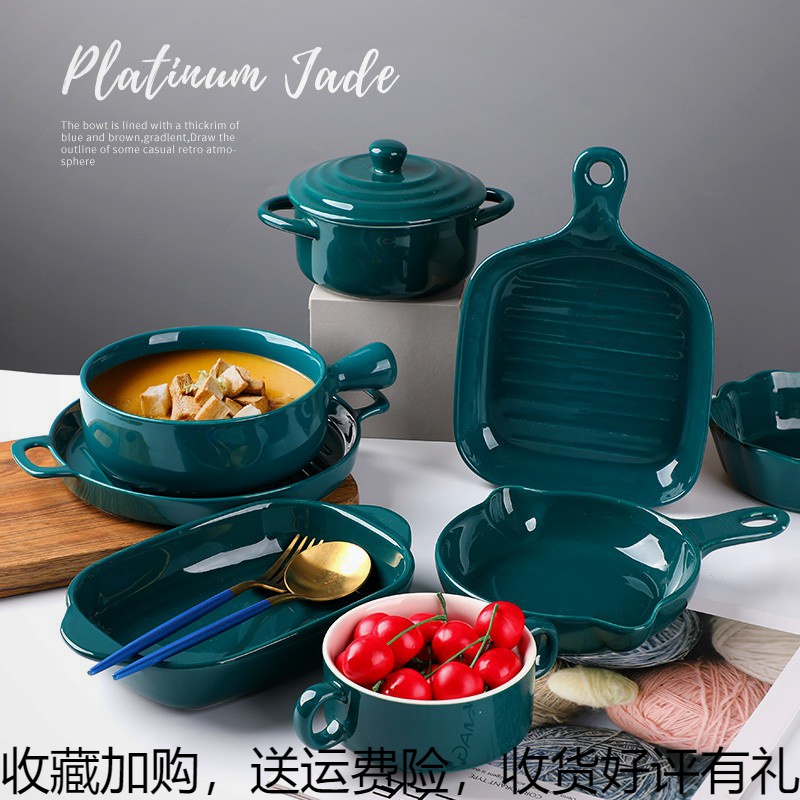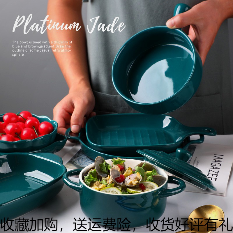 Oven Baking Rice Bowl double-ear dinner plate baking bowls Fruit pan Twin Ear Long Dinner Plate Handle Baking Pan Double Ear Congee Bowl Jewel Green Baking Handle Bowl Big Trumpet (SEND BRIGHT INK GREEN-WITH LID DOUBLE EAR CERAMICS