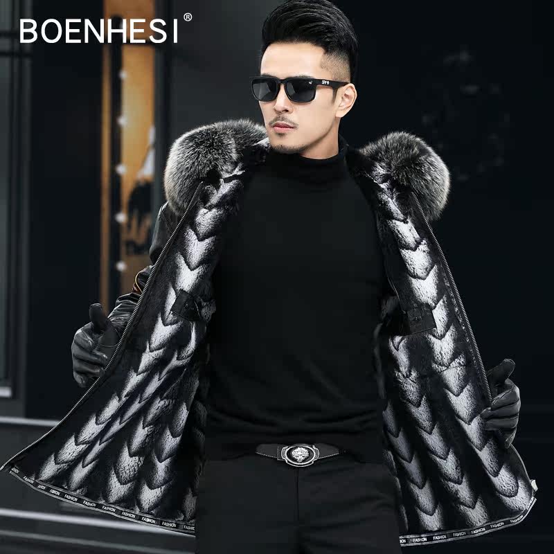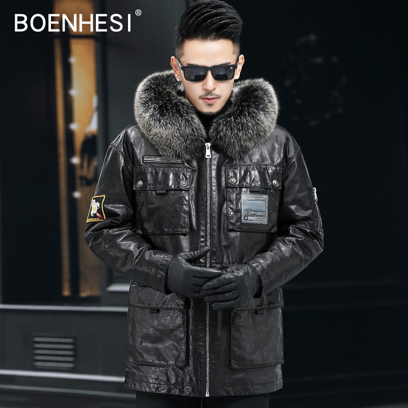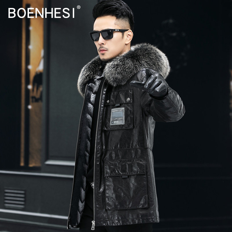 Winter genuine leather men's Haining fur mid-length oil wax top layer cowhide hooded windbreaker leather jacket trendy men