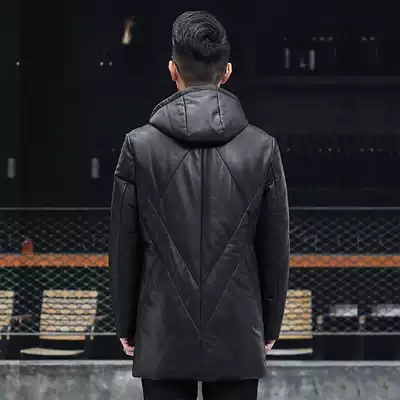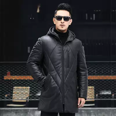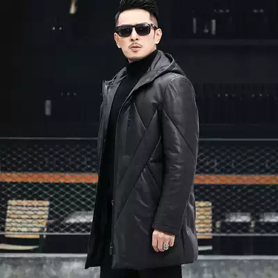 Leather down jacket men's medium and long version hooded sheep fur coat with velvet thickened winter Haining leather fur coat