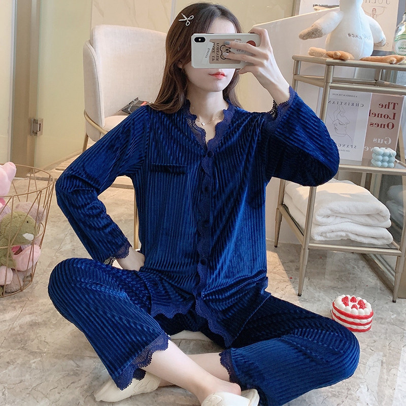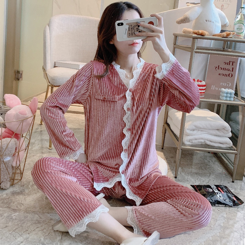 Autumn Winter Golden Velvet Pyjamas Lady Dianfen Cardigan With Long Sleeve Sexy Warm Clothing Suit Casual Home Wear