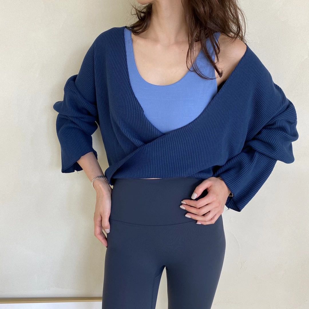 2021 Autumn Winter New South Korea Routine Yoga Long Sleeve Jersey Sloped Shoulder V Collar Pure Color Stripe Small Loose Short