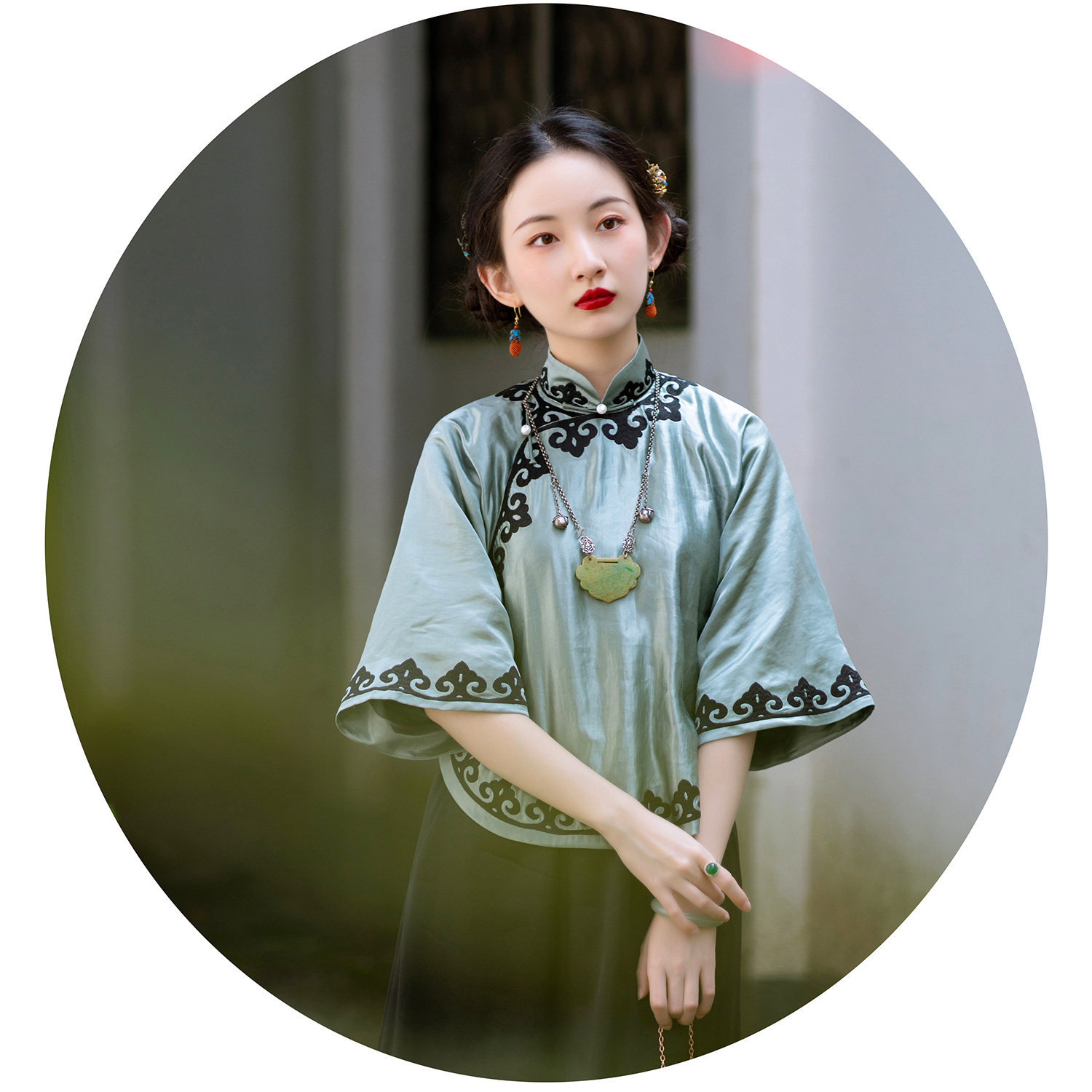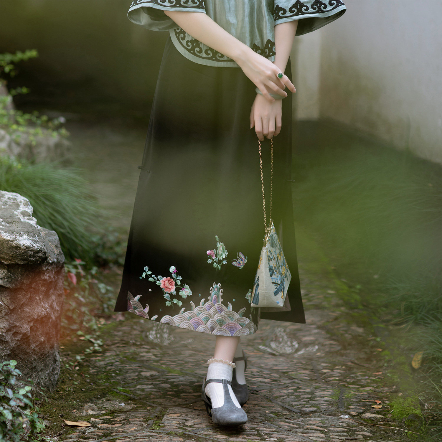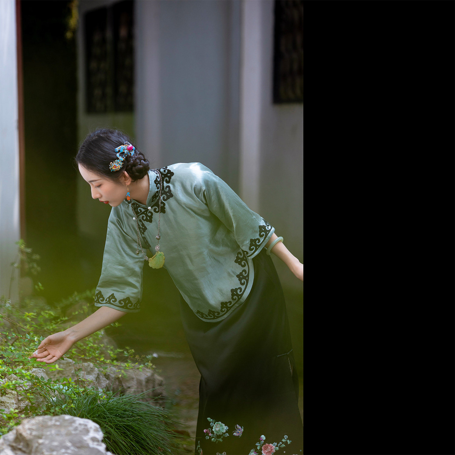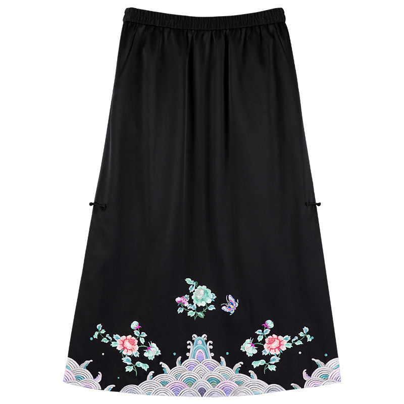 Embroidered curtain-Spring and autumn in the country Wind 100 hitch black genuine silk embroidered retro disc buckle Chinese half-body dress woman everyday