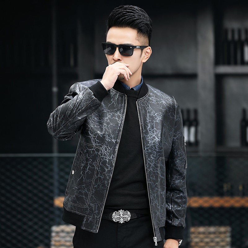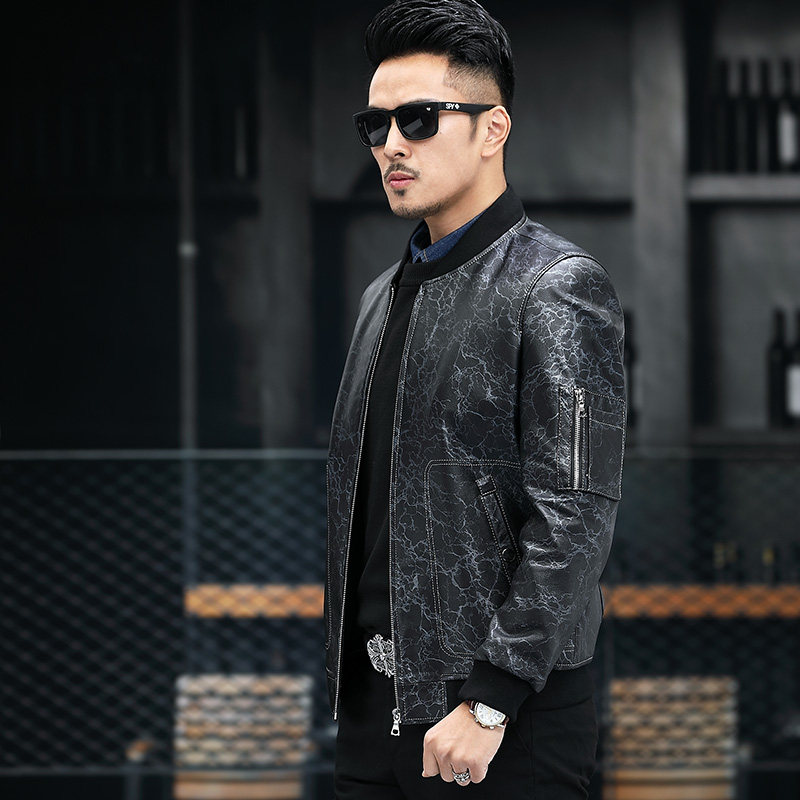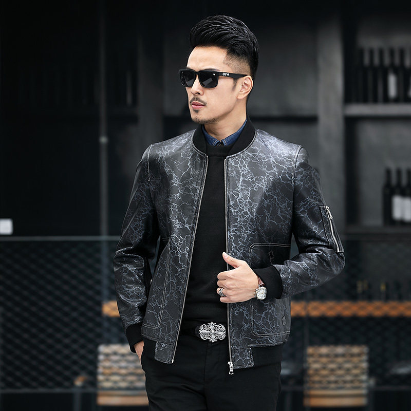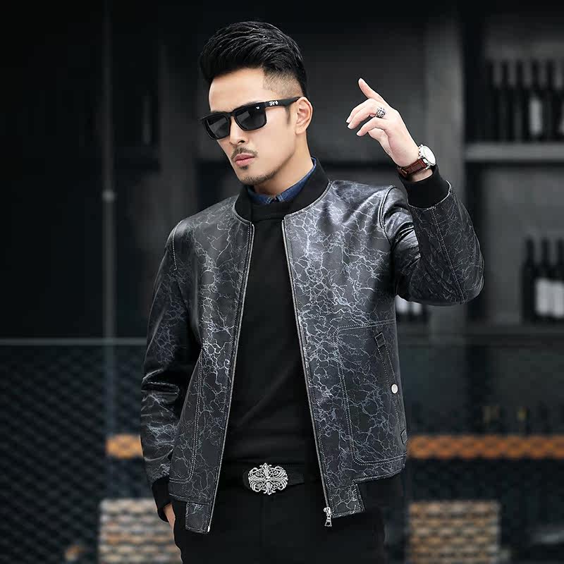 Leather leather men's printed head layer cowhide baseball collar short slim youth leather jacket jacket autumn and winter New