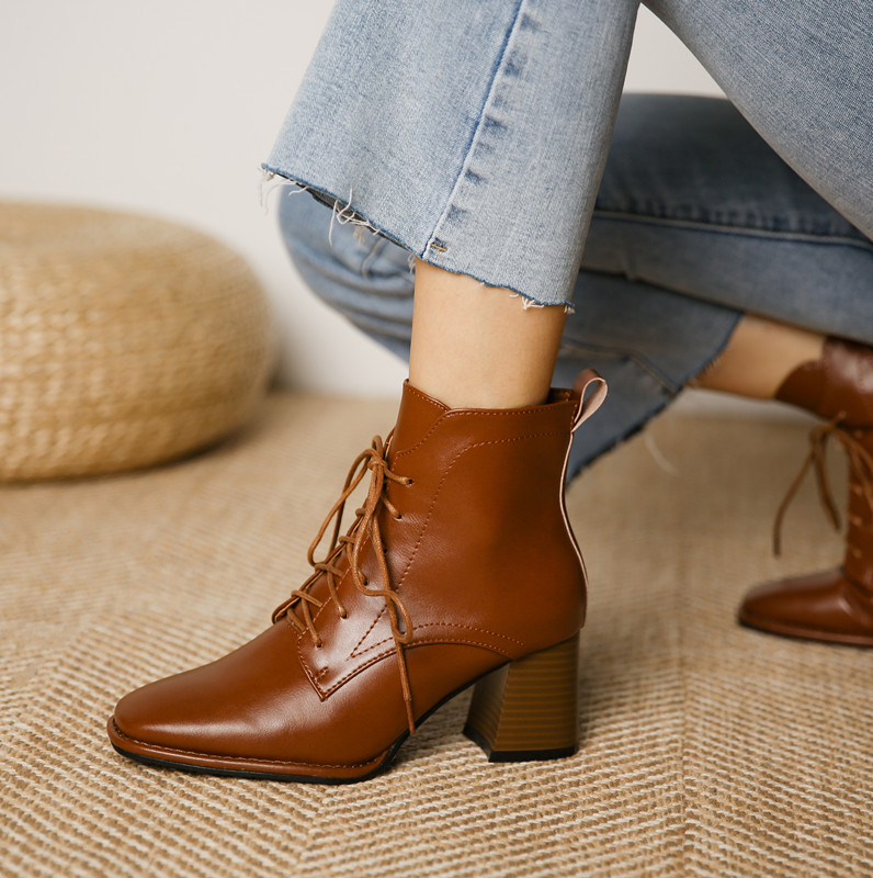 French boots women's 2022 early autumn thick heel lace brown high-heeled short boots women's retro British style Martin boots women