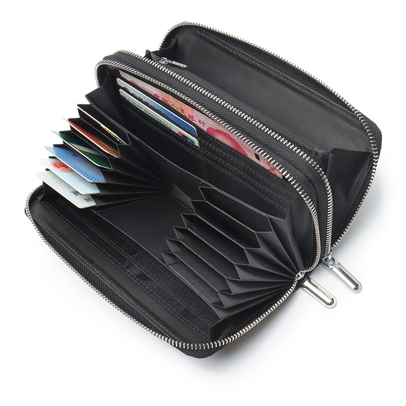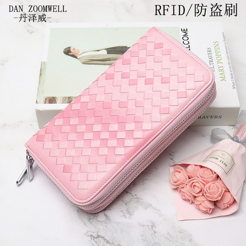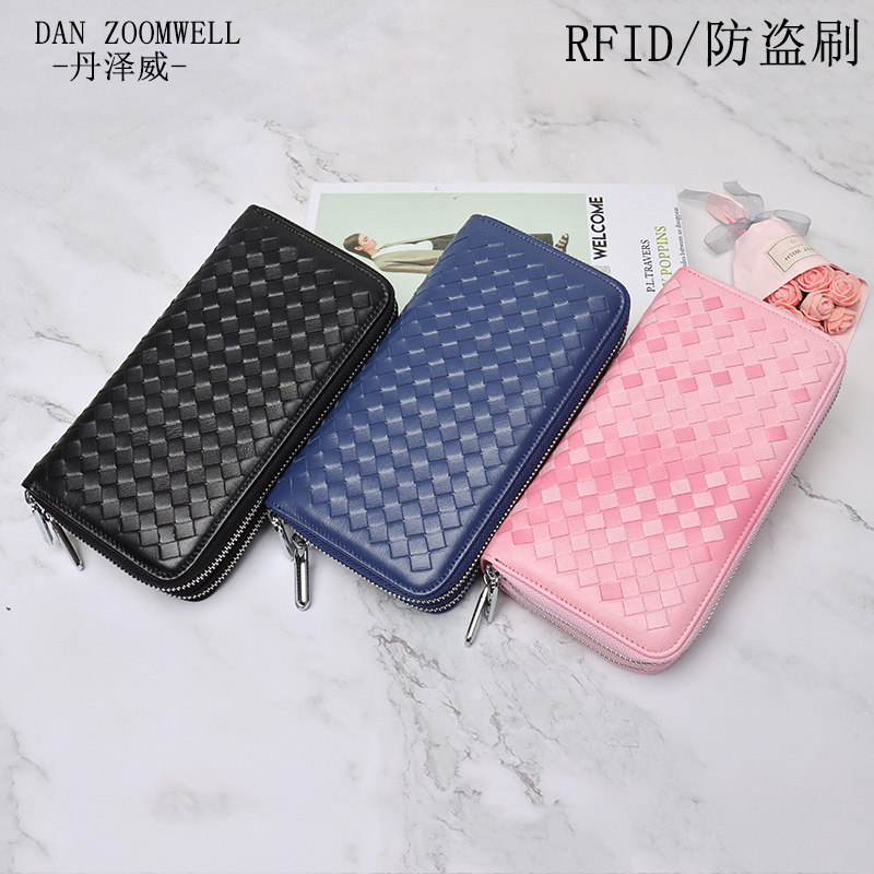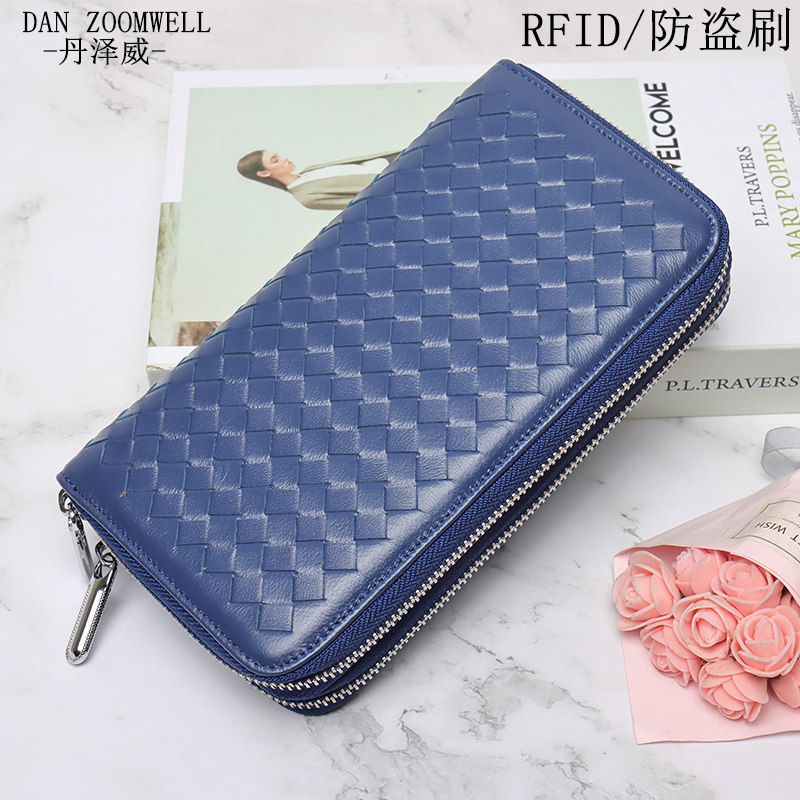 Korean version for men and women long handmade bag with double zipper and goat leather genuine leather woven RFID anti-theft brushed accordion card purse-Taobao