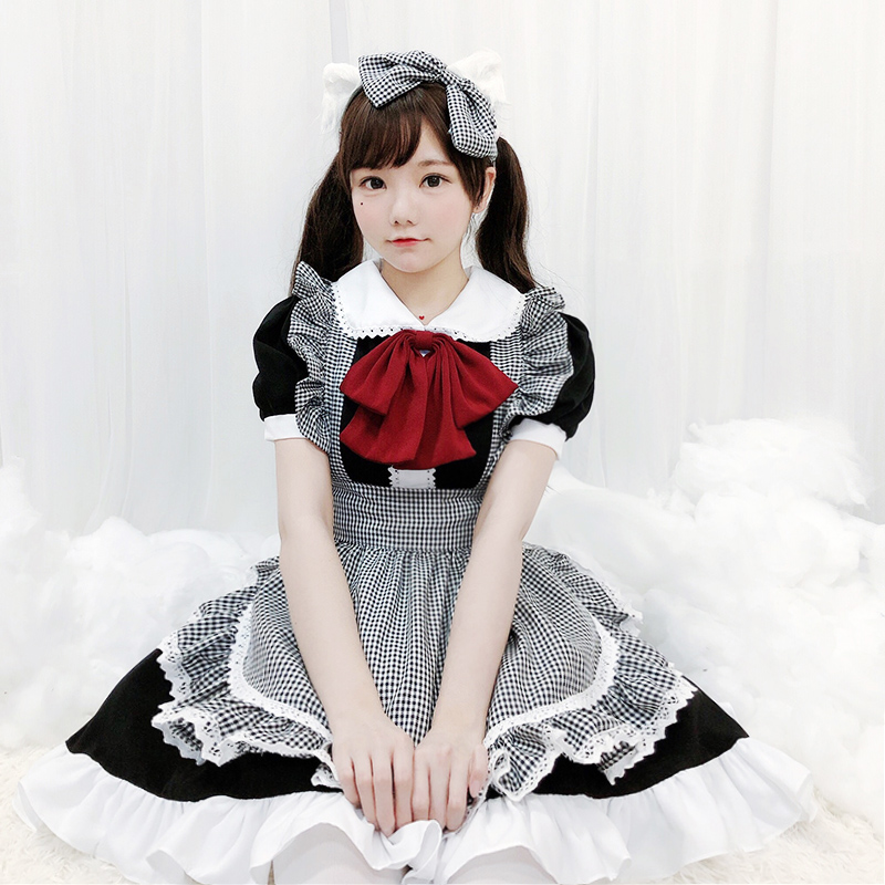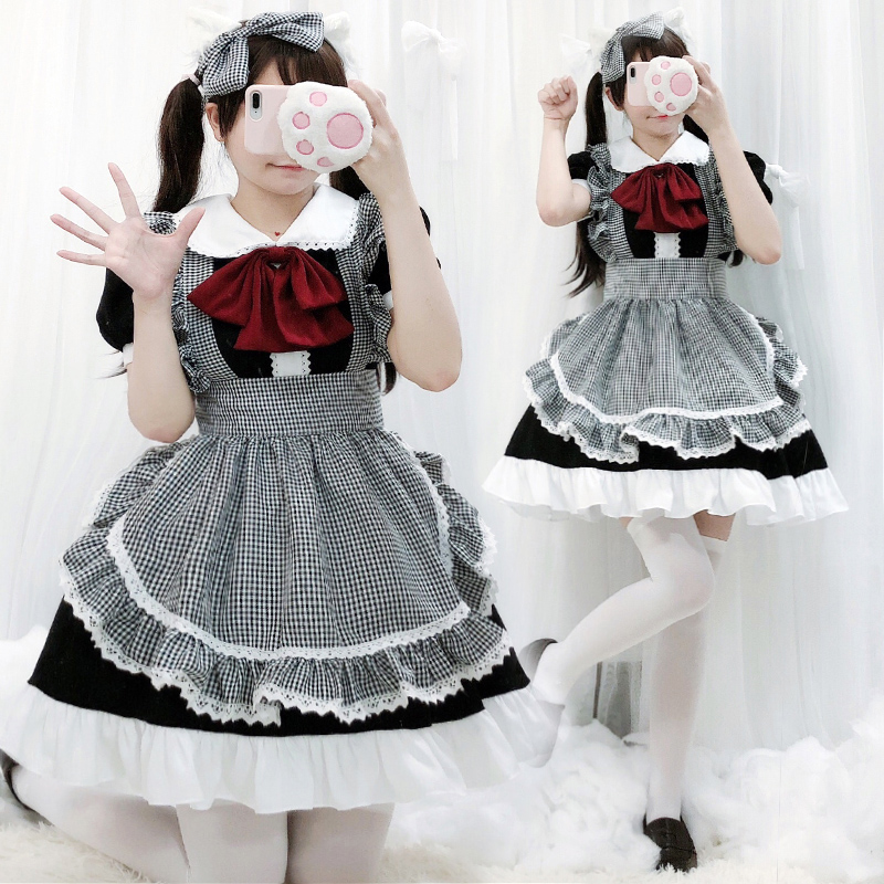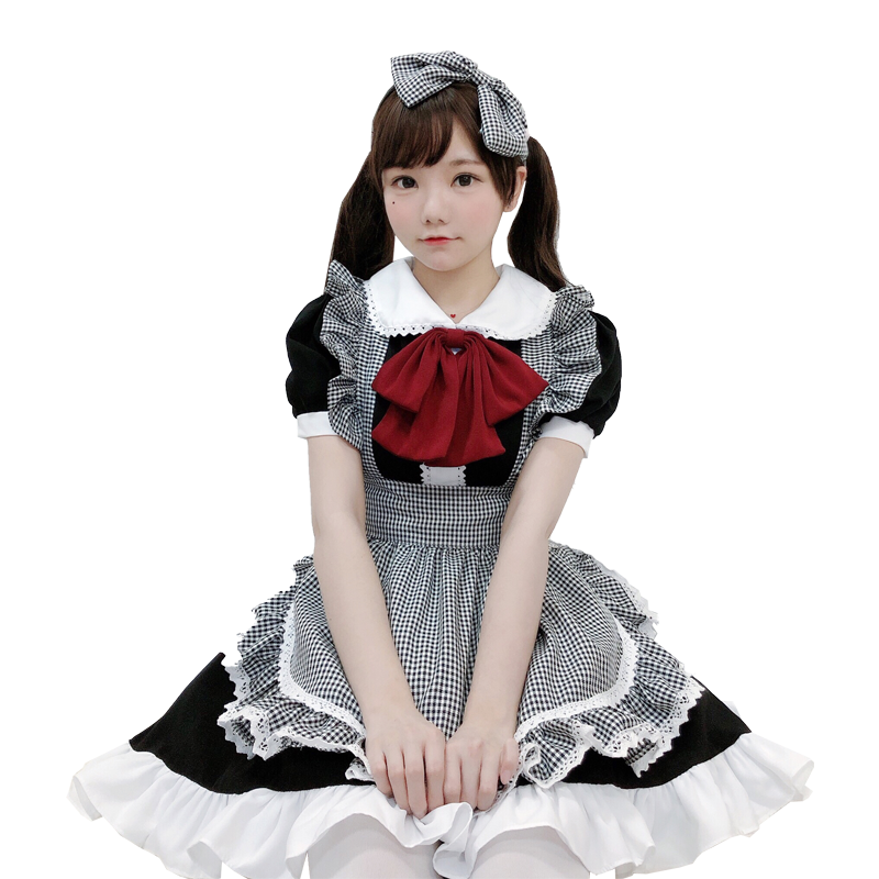 Black and white plaid maid Loli dress lolita Full set of maid clothes cute cute two yuan Japanese Lolita