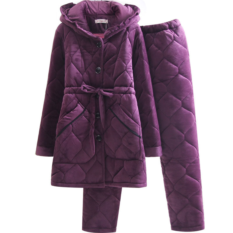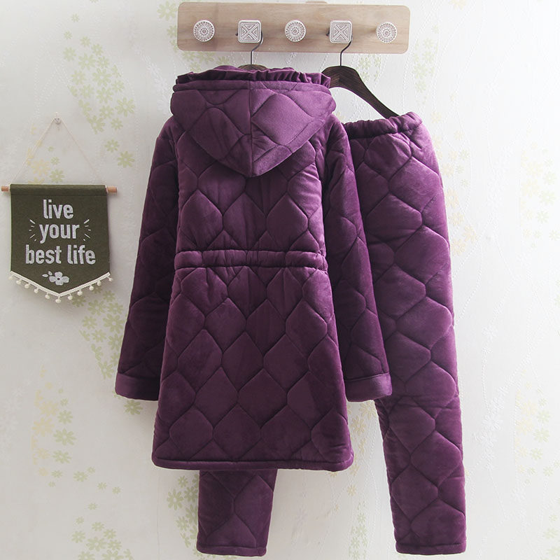 Solid color winter mid-length thickened coral fleece quilted hooded pajamas middle-aged mother confinement clothes pregnant women home clothes