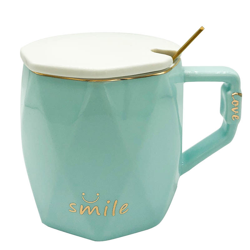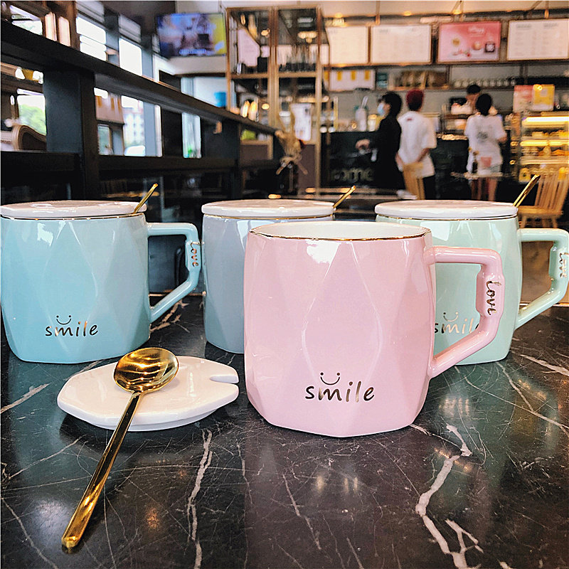 Nordic couple rhombus smiling ceramic cup mug water cup with lid spoon male and female students milk home teacup
