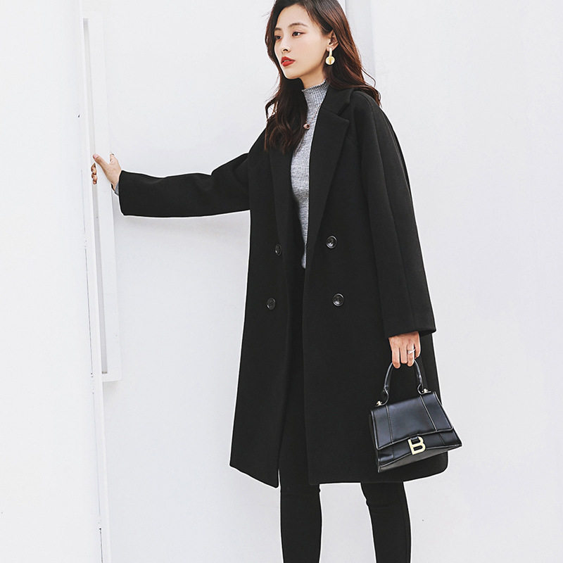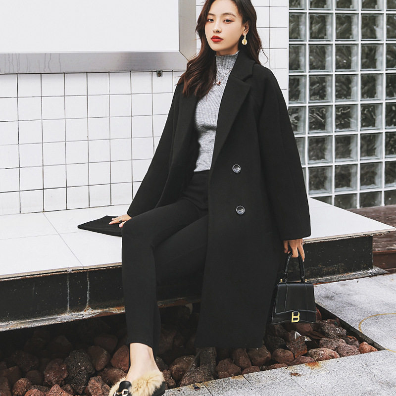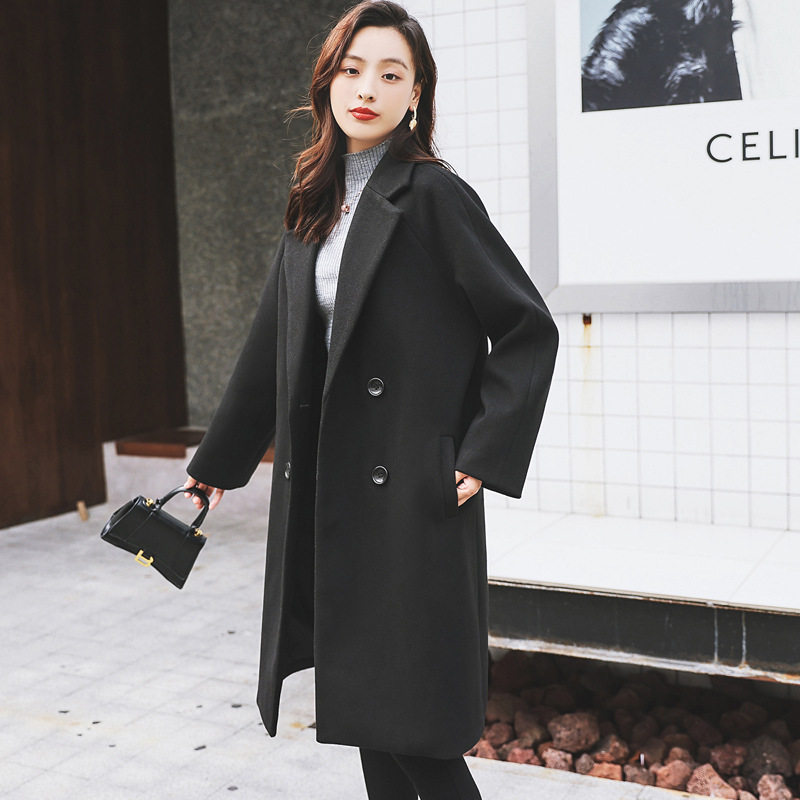 Black woolen coat women's mid-length fat mm200 catties autumn and winter large size women's Hepburn style thickened woolen coat