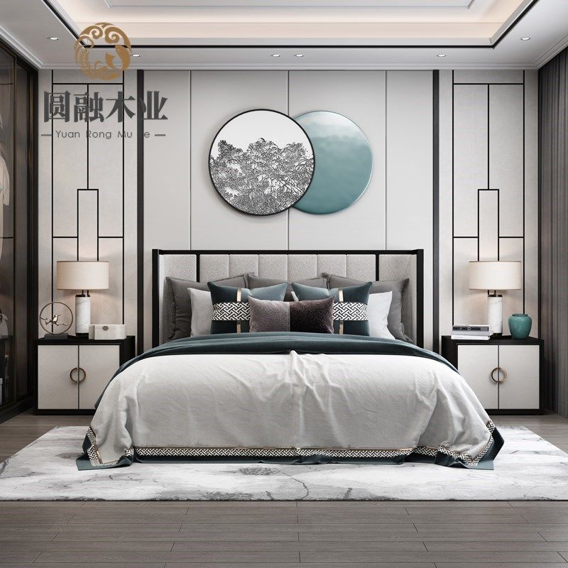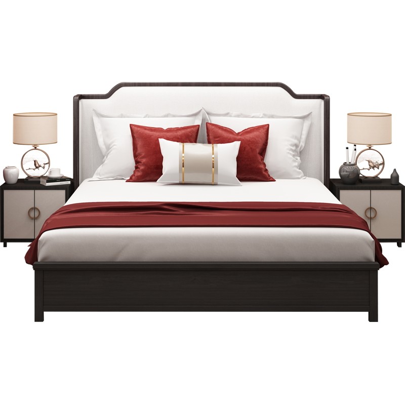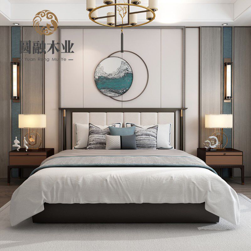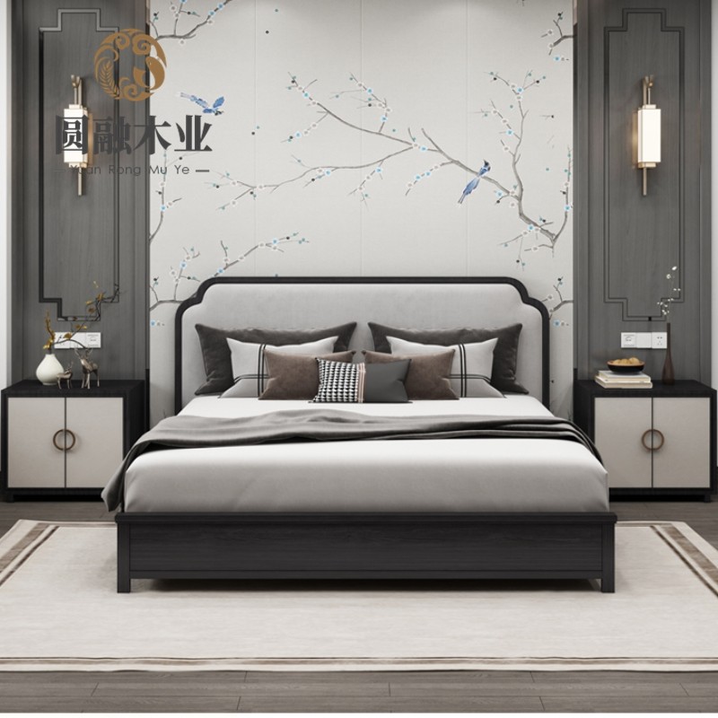 New Chinese style solid wood bed light luxury simple fabric 1 85m 2m double bed wedding bed model house sales office furniture