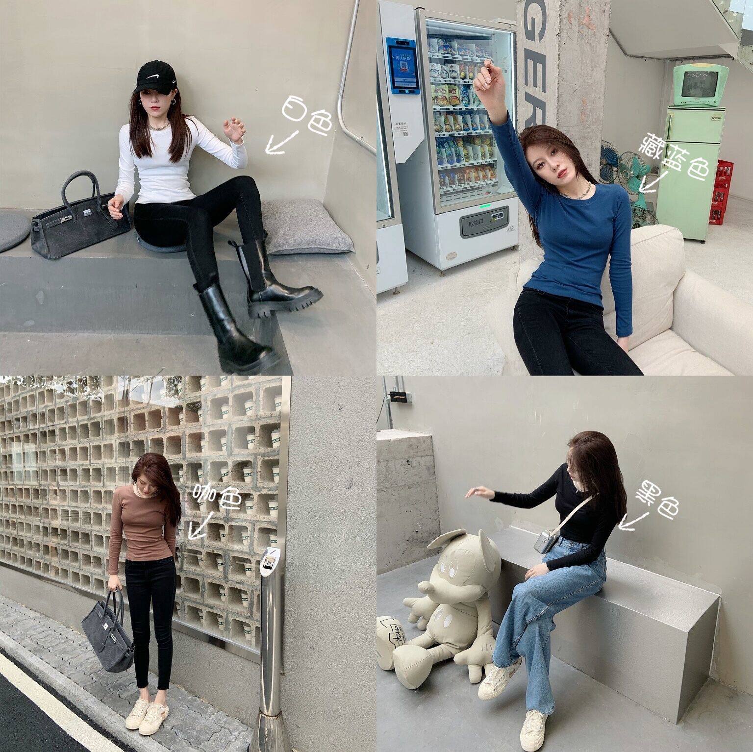 Brown top Black top White top Navy blue top