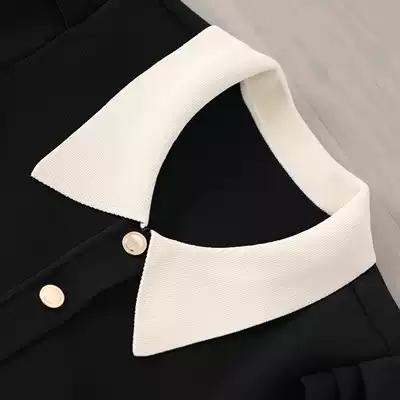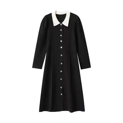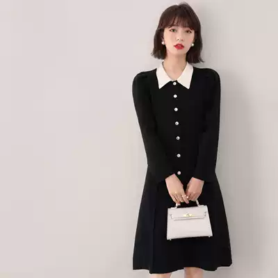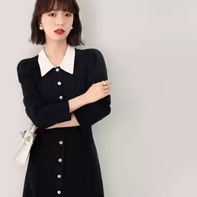 Spring 2021 new bubble sleeve temperament lapel small black skirt thin waist solid color knitted dress female