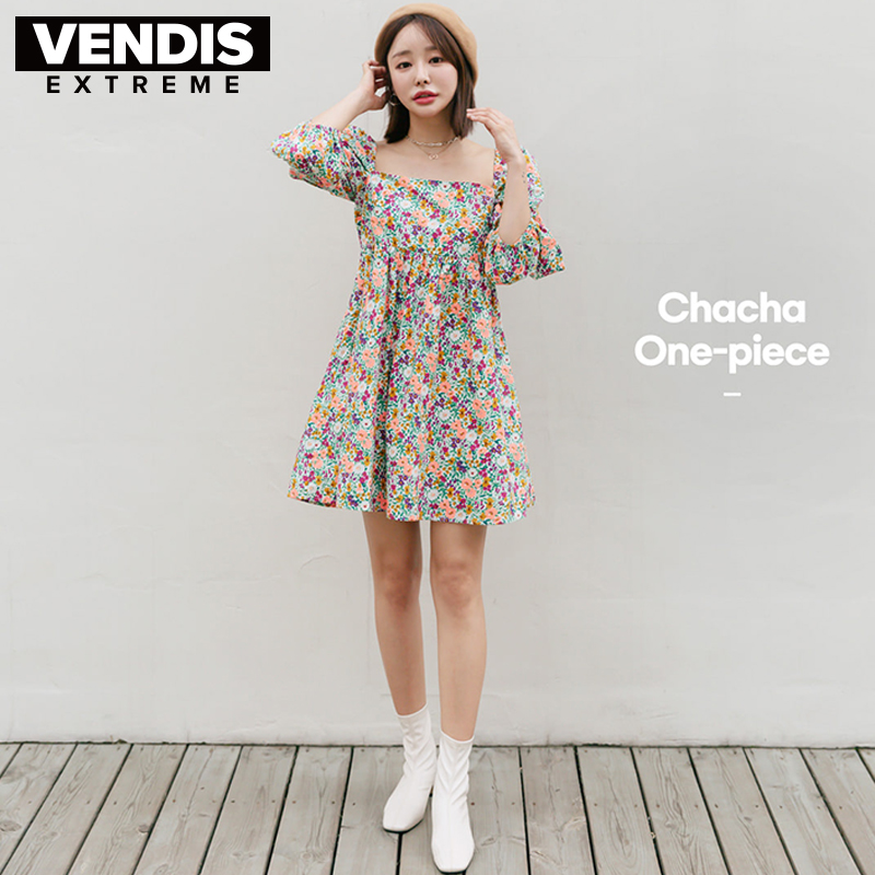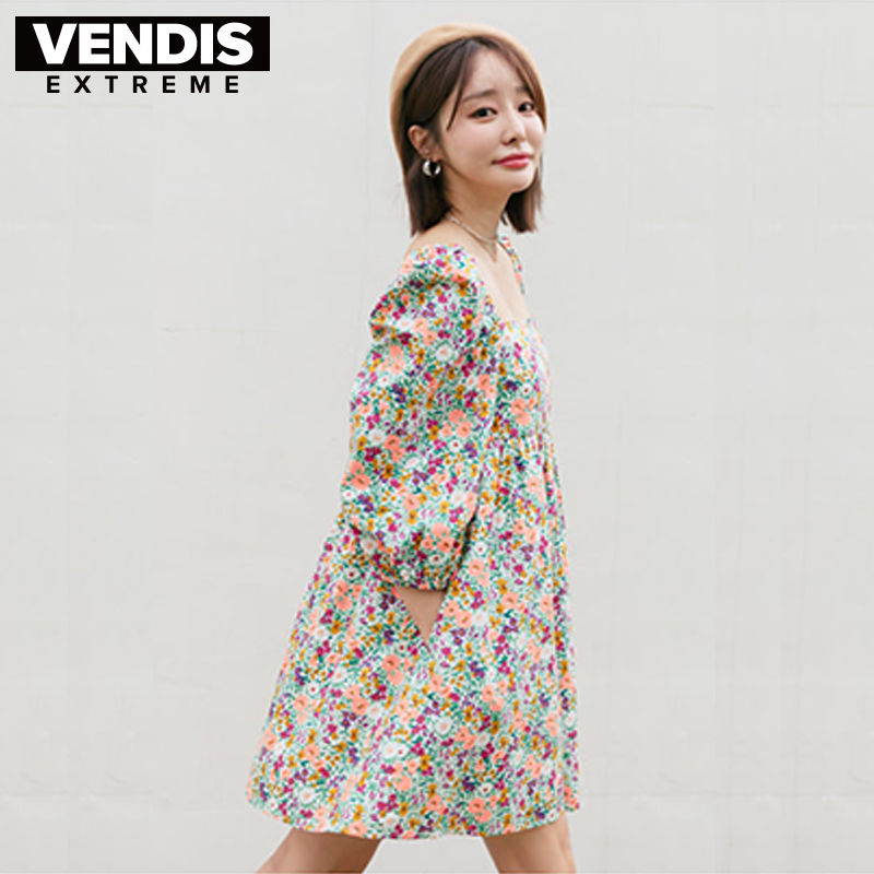 New one-piece dress casual youth with slim and high waist short skirts Broken Flowers Art Holiday Cute Sweet and Korean version of the sleeves-Taobao