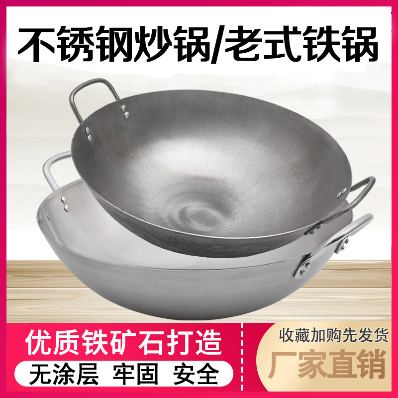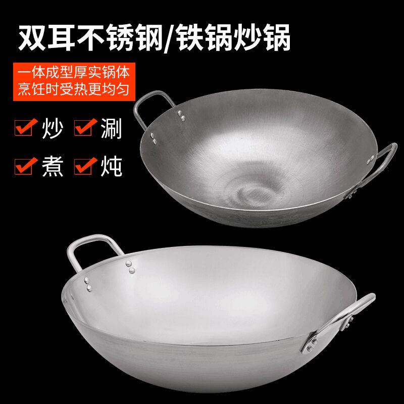 Double ear iron pot stainless steel cauldron restaurant frying pan old-fashioned handmade round bottom thickened printing pot uncoated wrought iron frying