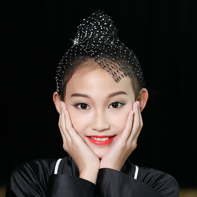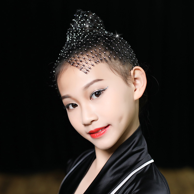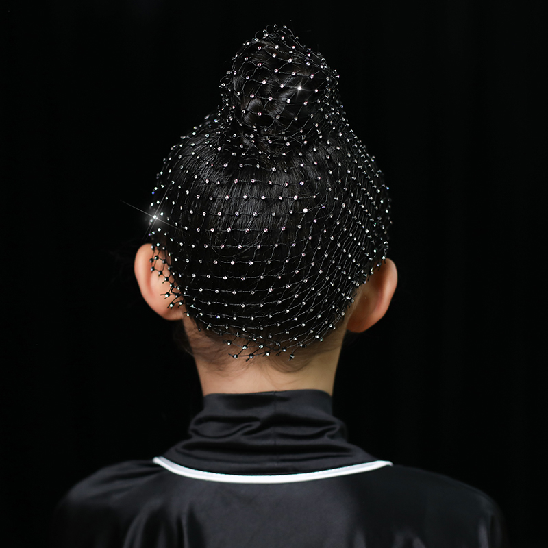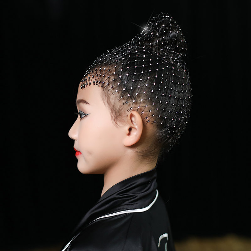 Dynasty Latin children's dance plate hair net girl professional Latin dance performance diamond-studded invisible black hair net set hair tail