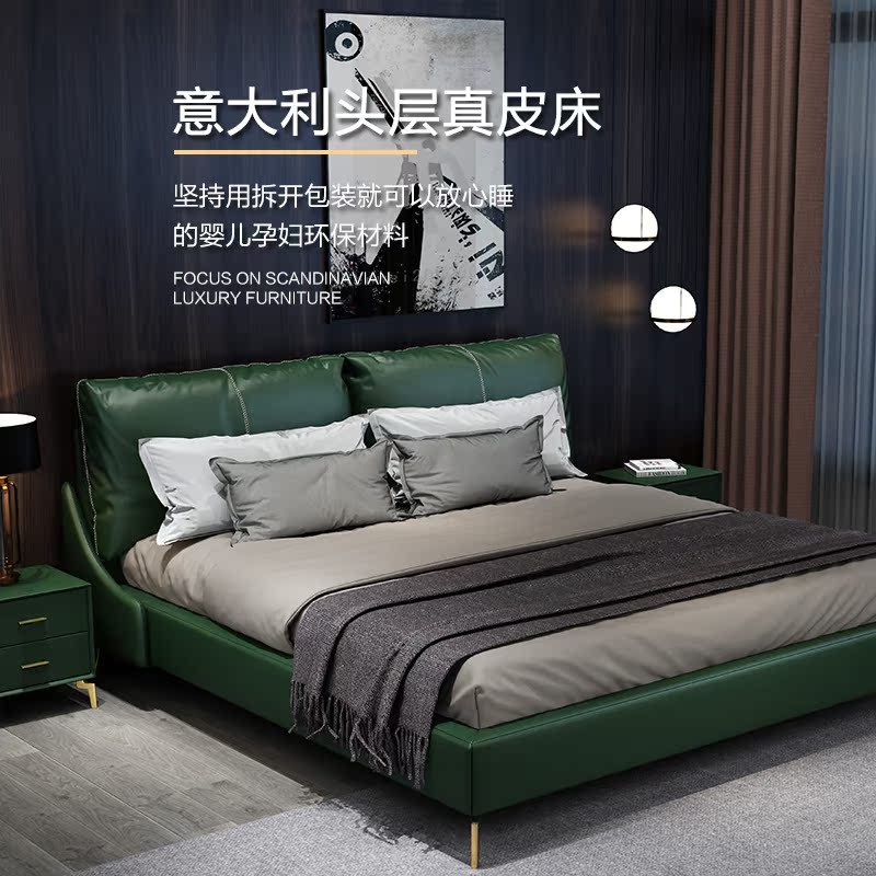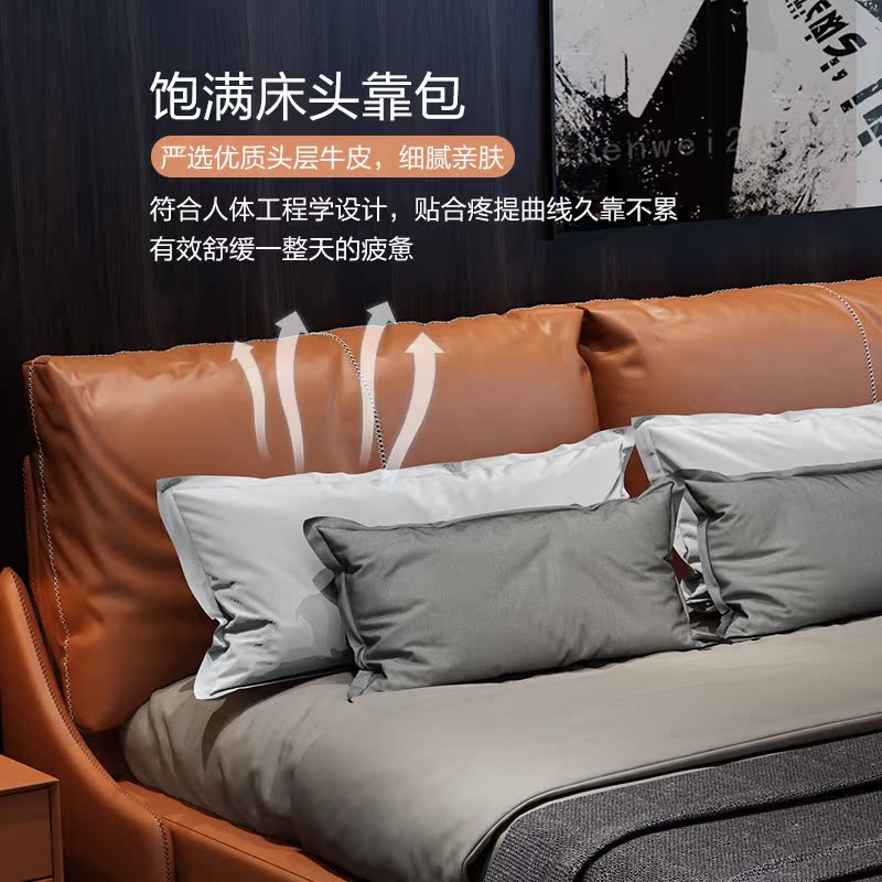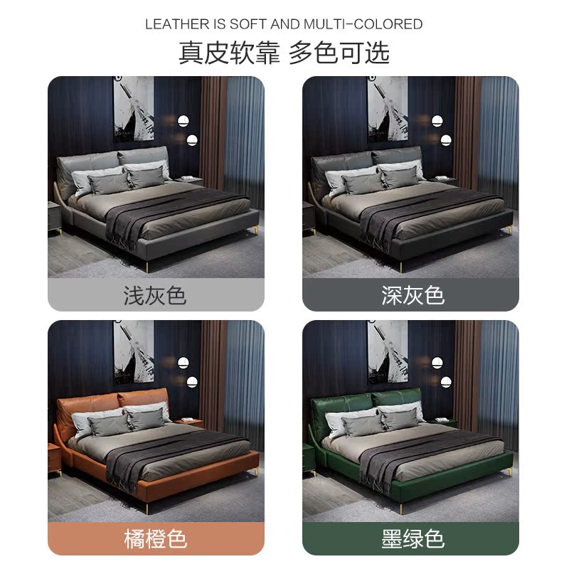 Nordic Genuine Leather Bed Willpower Light Extravagant Modern Net Red Bed Master Bedroom With double leather headbed Bull Leather Soft-covered Wedding Bed
