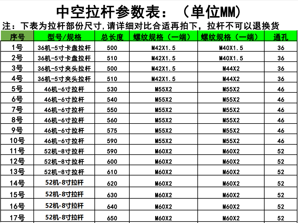 No 1-36 machine tie rod 500MM length hole 36MM No 2-36 machine tie rod 510MM length hole 36MM No 3-36 machine tie rod 500MM length HOLE 36MM No 3-36 machine tie rod 500MM length hole 36MM No 3-36 machine tie rod 500MM length