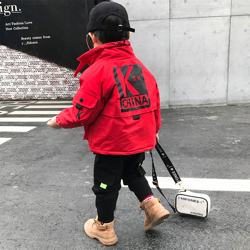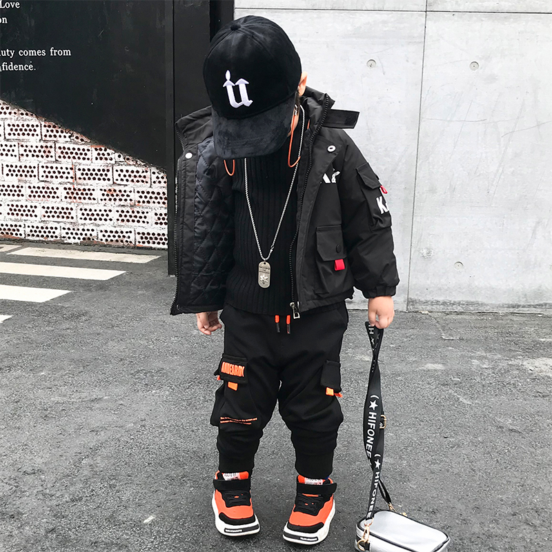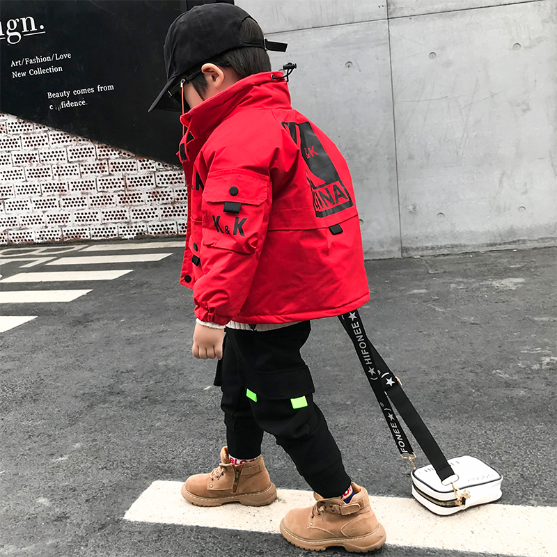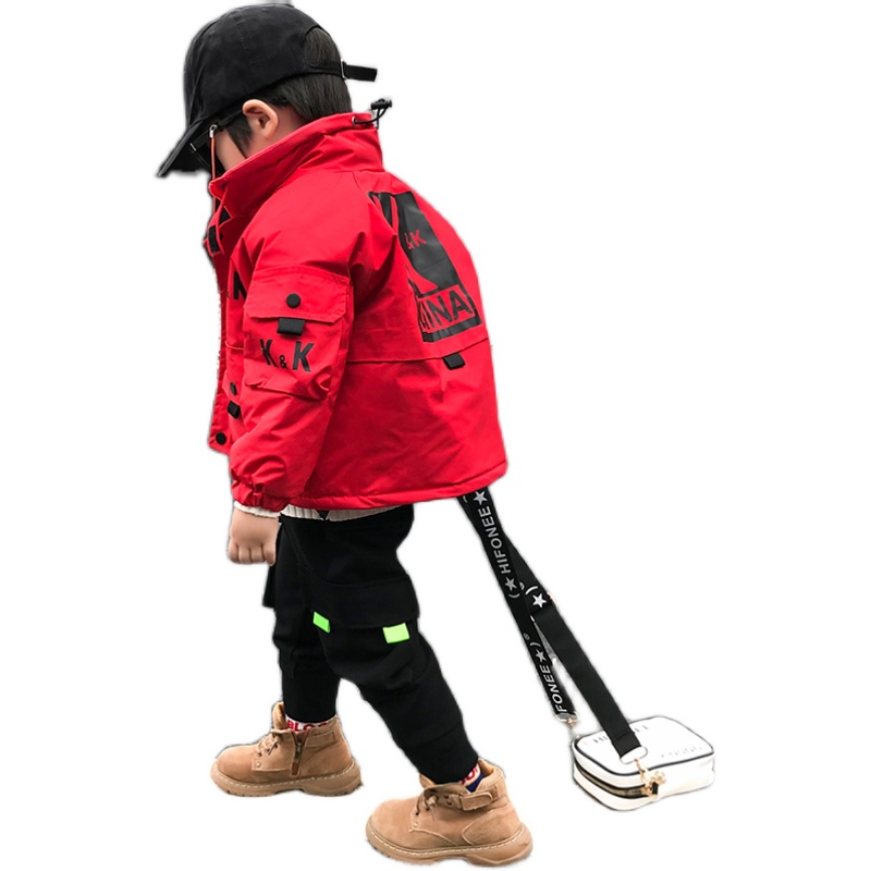Boy Laid Cotton Jacket 2022 Autumn Winter Plus Cotton Male Baby Fashion Winter Dress Foreign Pie Children Tooling Thickened Jacket Tide