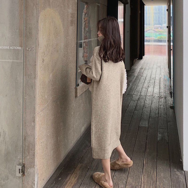 Long dress with coat in autumn and winter with long sweater dress over knee loose and knitted dress temperament