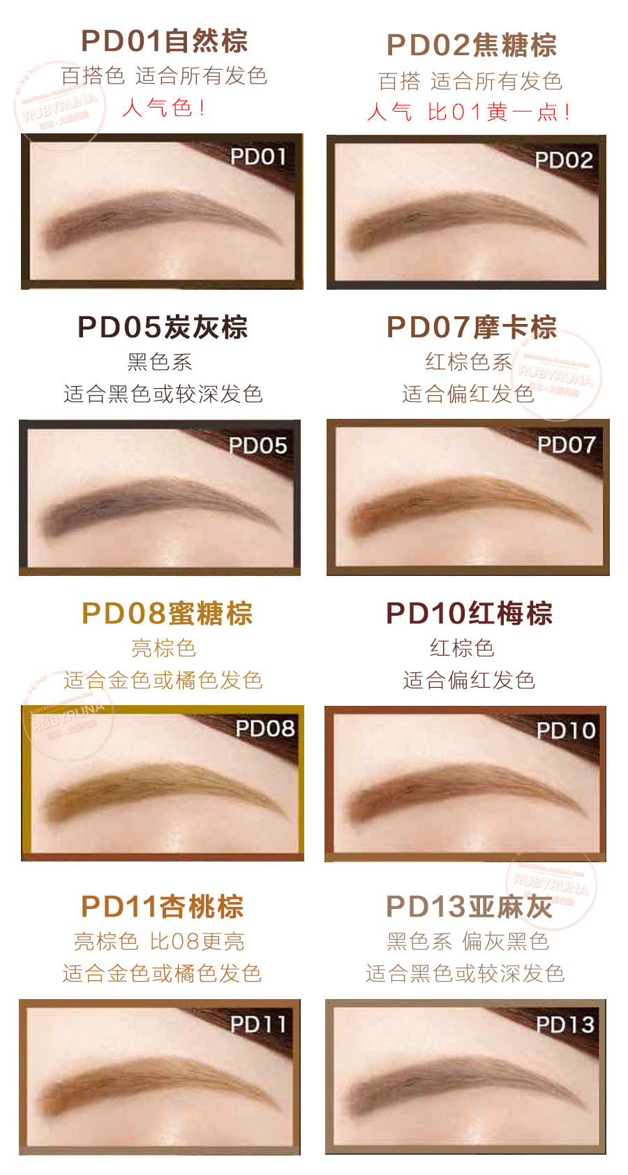 PD01 natural brown ~ popularity PD02 caramel brown ~ popularity PD05 charcoal grey brown PD07 Moka brown PD08 honey brown PD10 red plum brown PD11 apricot brown PD13