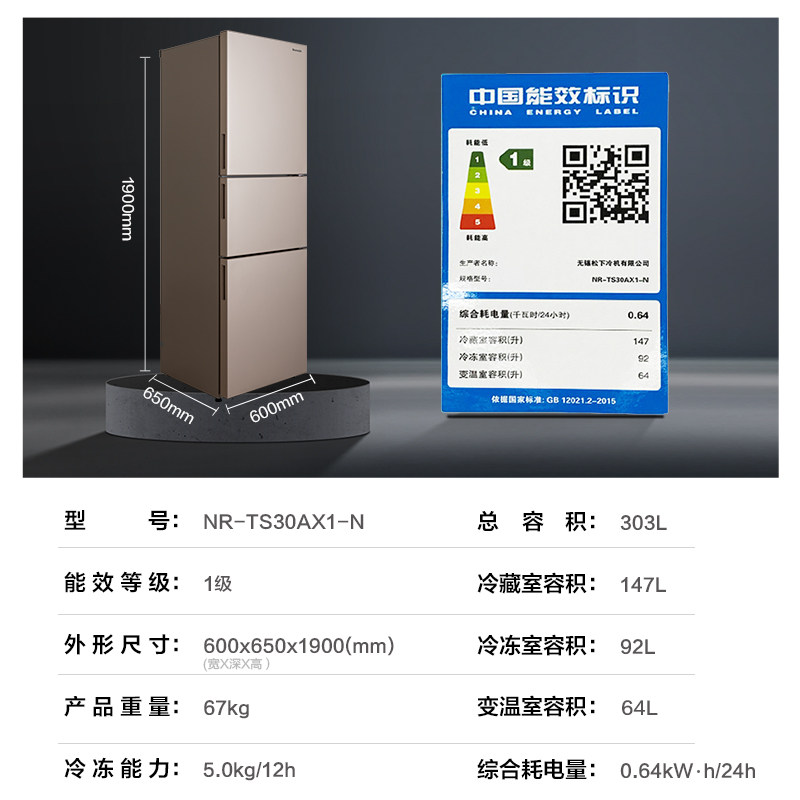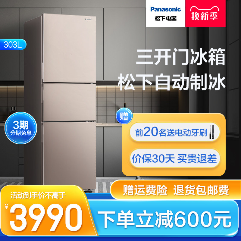 Panasonic three-door refrigerator NR-TS30AX1-N intelligent ice making air-cooled frost-free frequency conversion household first-class energy saving