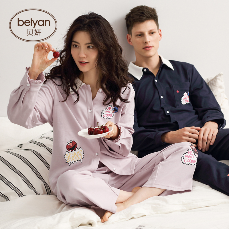 Beyan Spring Autumn Season Pure Cotton Lovers Sleep Clothes Loose Woman Long Sleeve Cardiovert Cartoon Male Korean Version Full Cotton Home Suit Suit