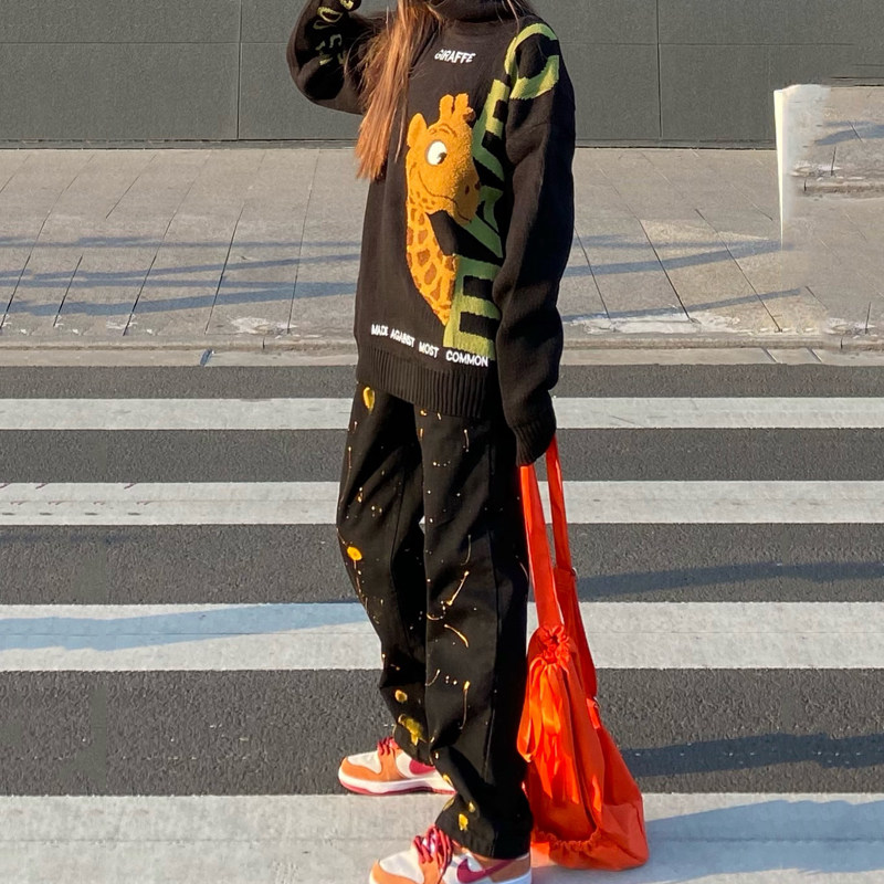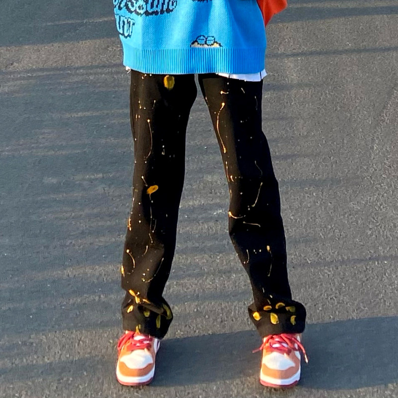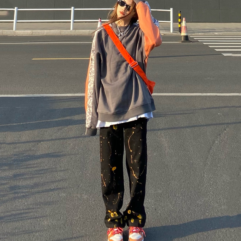 Ink-washed jeans black high-waisted jeans women's trendy brand ins street men's loose straight tube slim cigarette pants