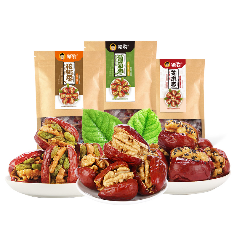 (Walnuts) red dates and walnuts 250gX1 bags (vines) red dates, walnuts, raisins 250gX1 bags (sesame dates) red dates, walnuts, black sesame seeds 250gX 1 bag (one pack for each of three flavors) 250gX3 bags (walnut dates) 250gX3 bags (vines) 250gX3 bags (sesame dates) 250gX3 bags