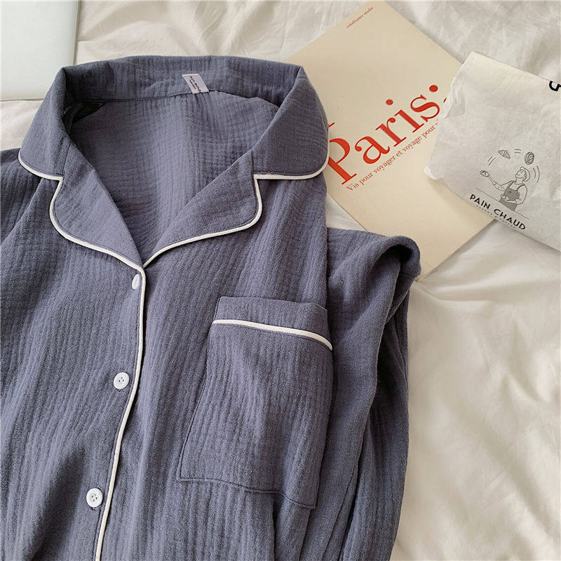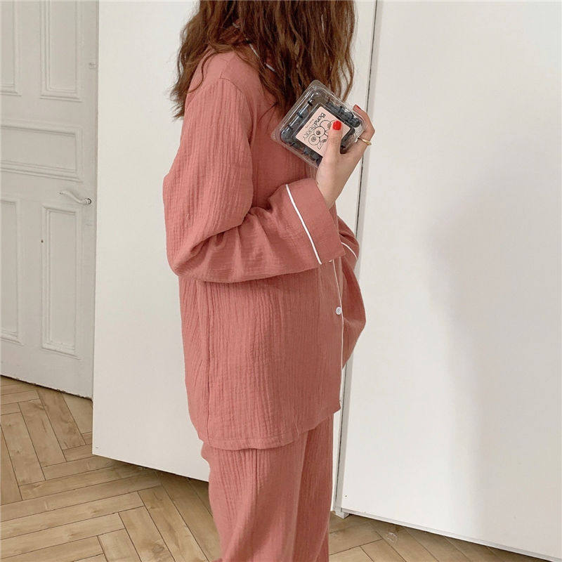 Cotton gauze long sleeve pajamas women fall set student ins wind loose solid color loungewear trousers two-piece set