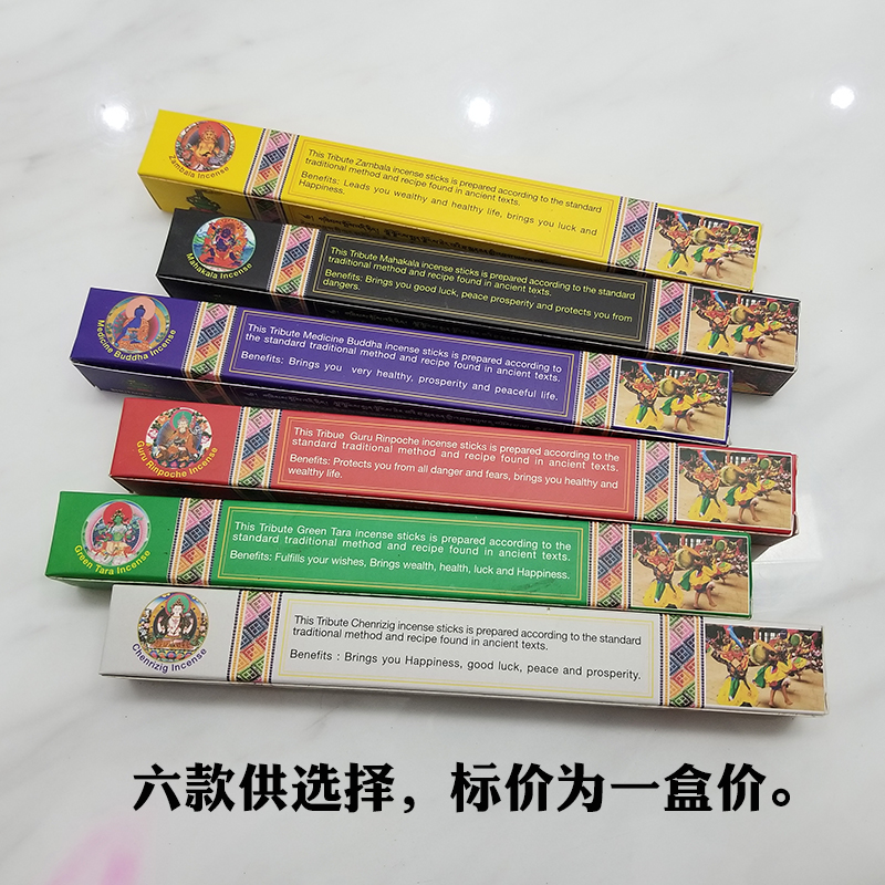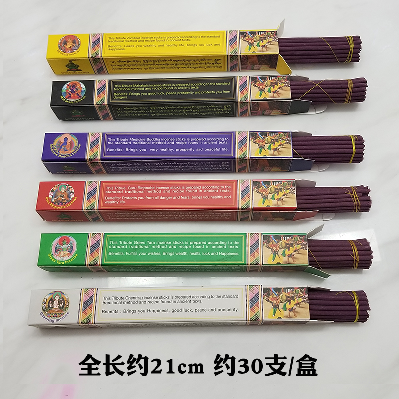 Lotus Peanut Incense (Red) Green Tara Bodhisattva Incense (Green) Yellow Fortune God Incense (Yellow) Four-Armed Guanyin Incense (White) Maha Gala Incense (Black) Medicine Buddha Incense (Blue)