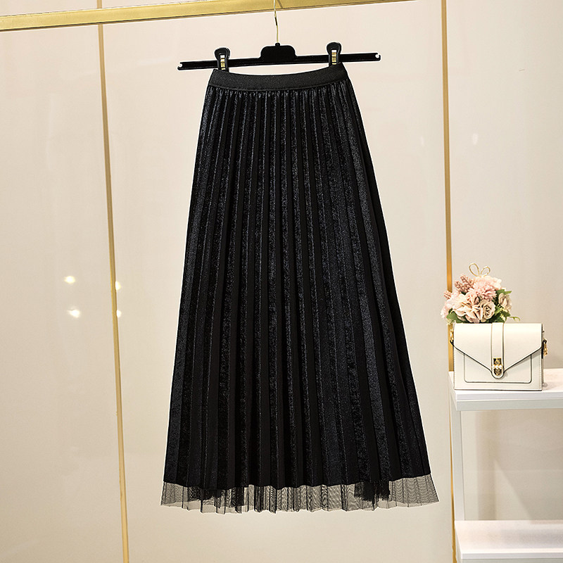 Double-sided gold velvet skirt autumn and winter women's high waist mid-length A-line skirt is thin and temperament mesh pleated skirt