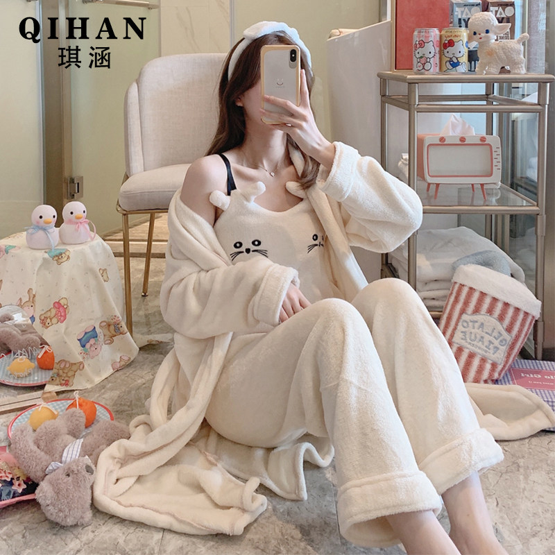 Three-piece coral velvet pajamas women's autumn and winter thickened plus velvet nightgown 2021 new net red home wear flannel