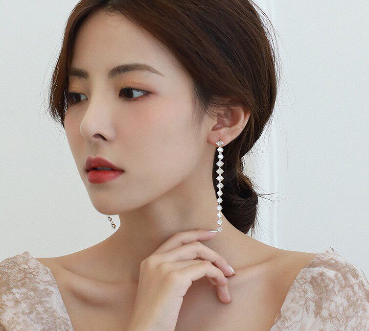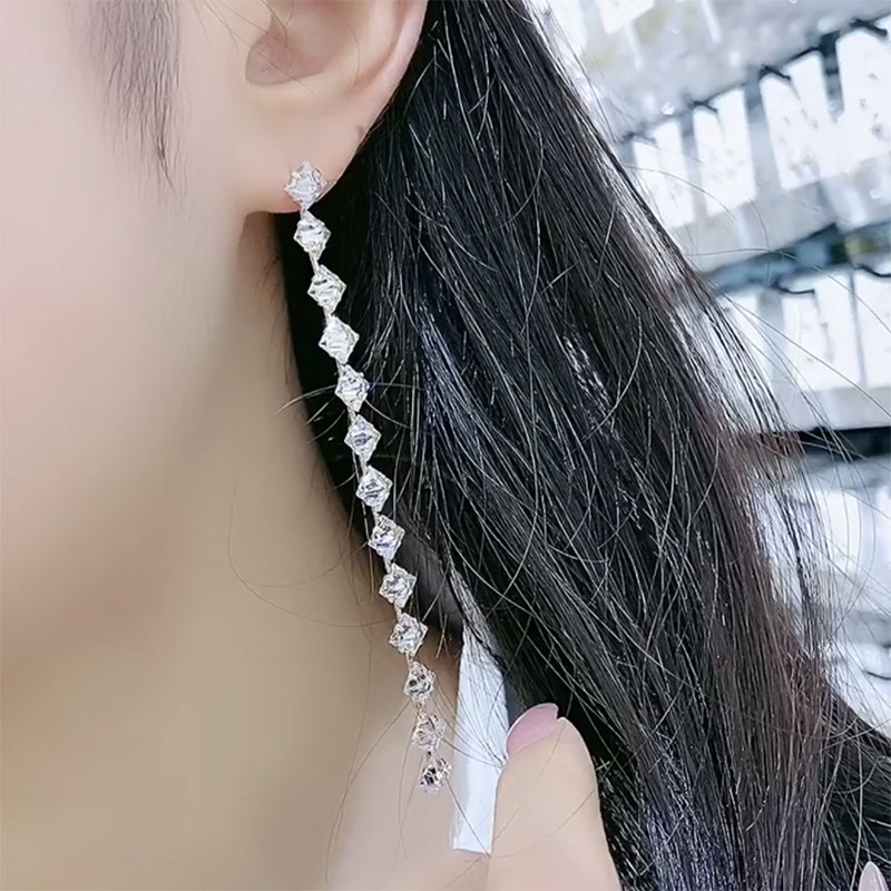 925 Silver Needle Long Crystal Flow Su Earring Korea luxury Zircon Advanced French - style lean - net red ear