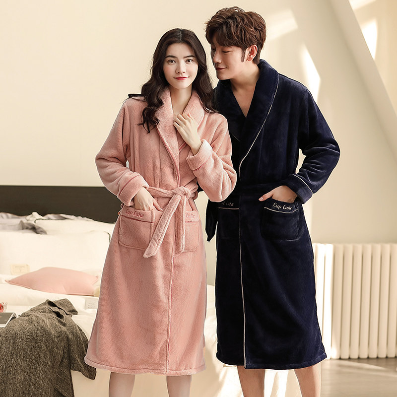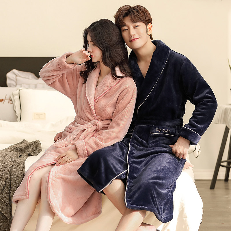 Couple's pajamas fall and winter mid-length coral fleece nightgown men's flannel plus velvet thickened warm Japanese-style home clothes for women