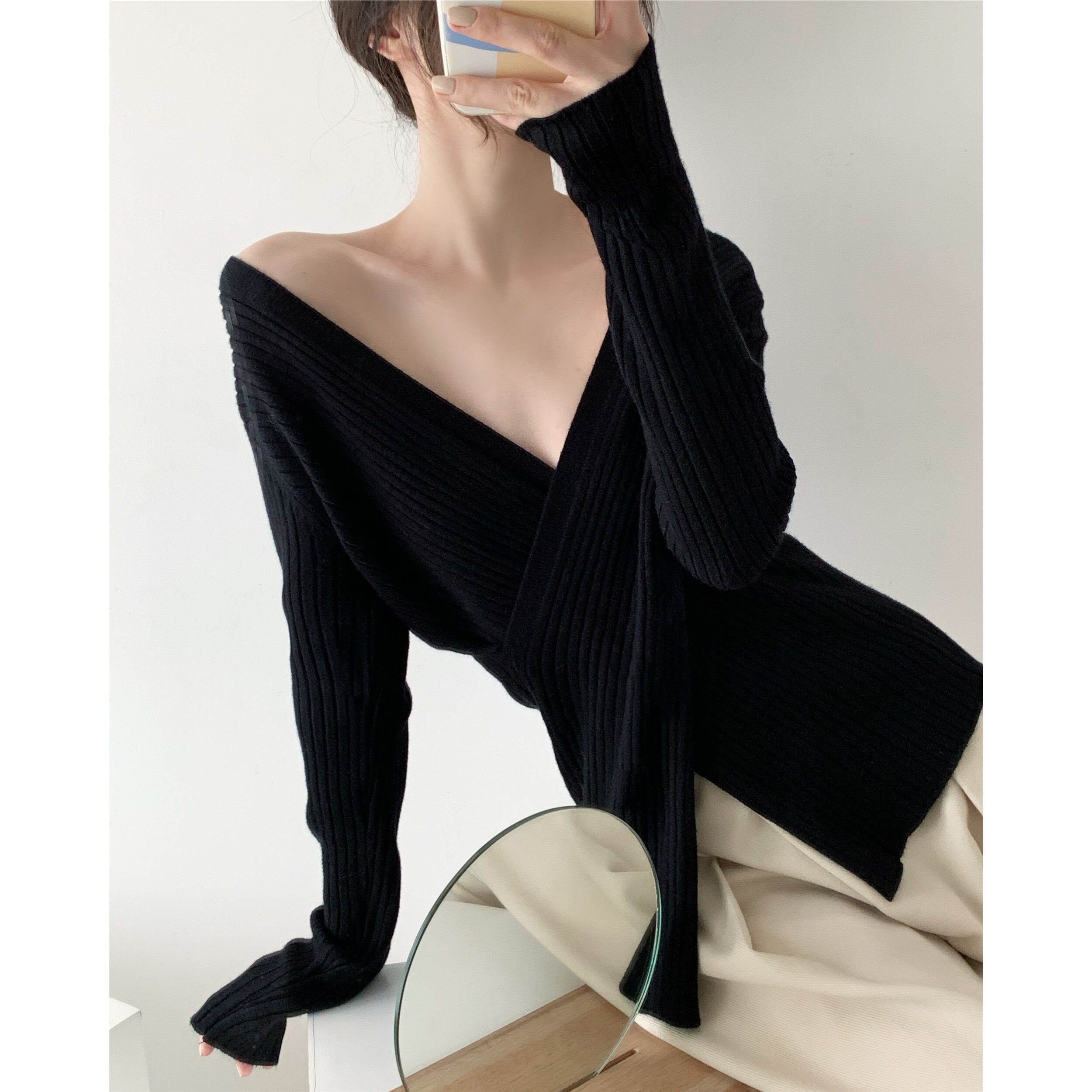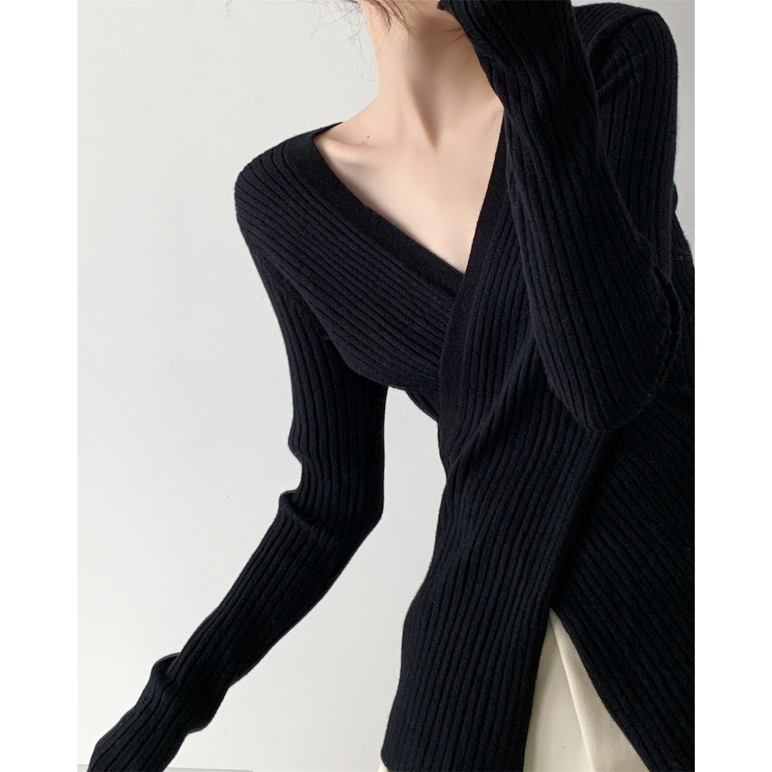ICTS you smile as if that good weather milk curry black explicit collarbone and sweaters cross V neckline sweater