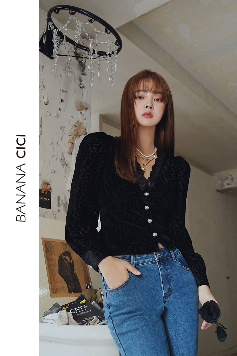 (Same style in the mall) BANANACICI2020 winter V-neck lace single-breasted velvet French shirt women
