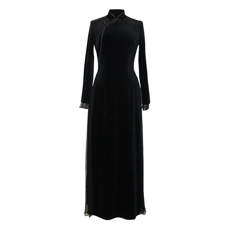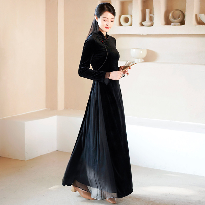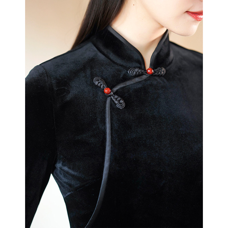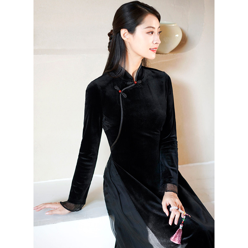 Chuchan Chinese style 2022 autumn and winter women's retro slim fit velvet silk wrinkled black modified Aodai cheongsam dress
